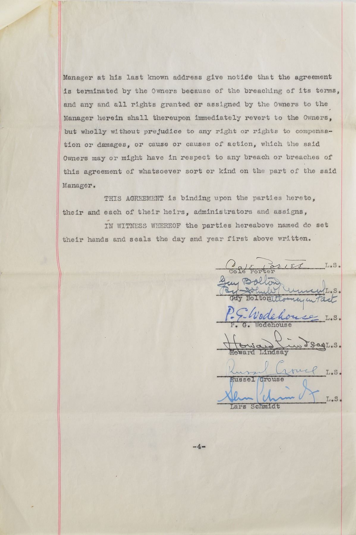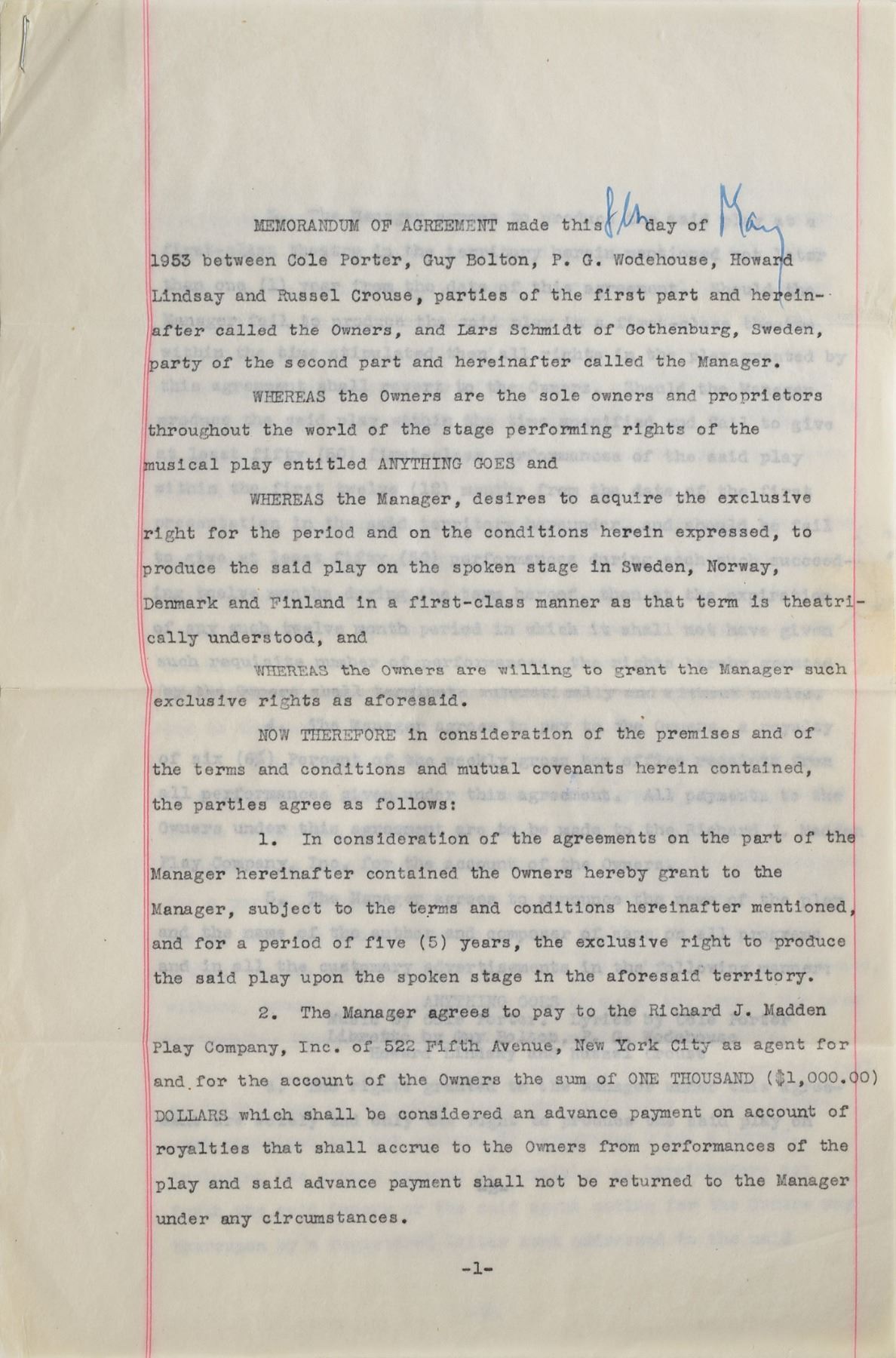 DS, four pages, 8.5 x 13, May 8, 1953. Memorandum of agreement between Lars Schmidt of Gothenburg and Cole Porter, Guy Bolton, P. G. Wodehouse, Howard Lindsay, and Russel Crouse, in which the latter group grant exclusive rights for the "musical play entitled Anything Goes" to be performed "on the spoken stage in Sweden, Norway, Denmark and Finland in a first-class manner…for a period of five (5) years." Signed at the conclusion in black or blue ink by Porter, Wodehouse, Crouse, Lindsay, and Schmidt (Bolton's attorney has signed on his behalf). In fine condition.
