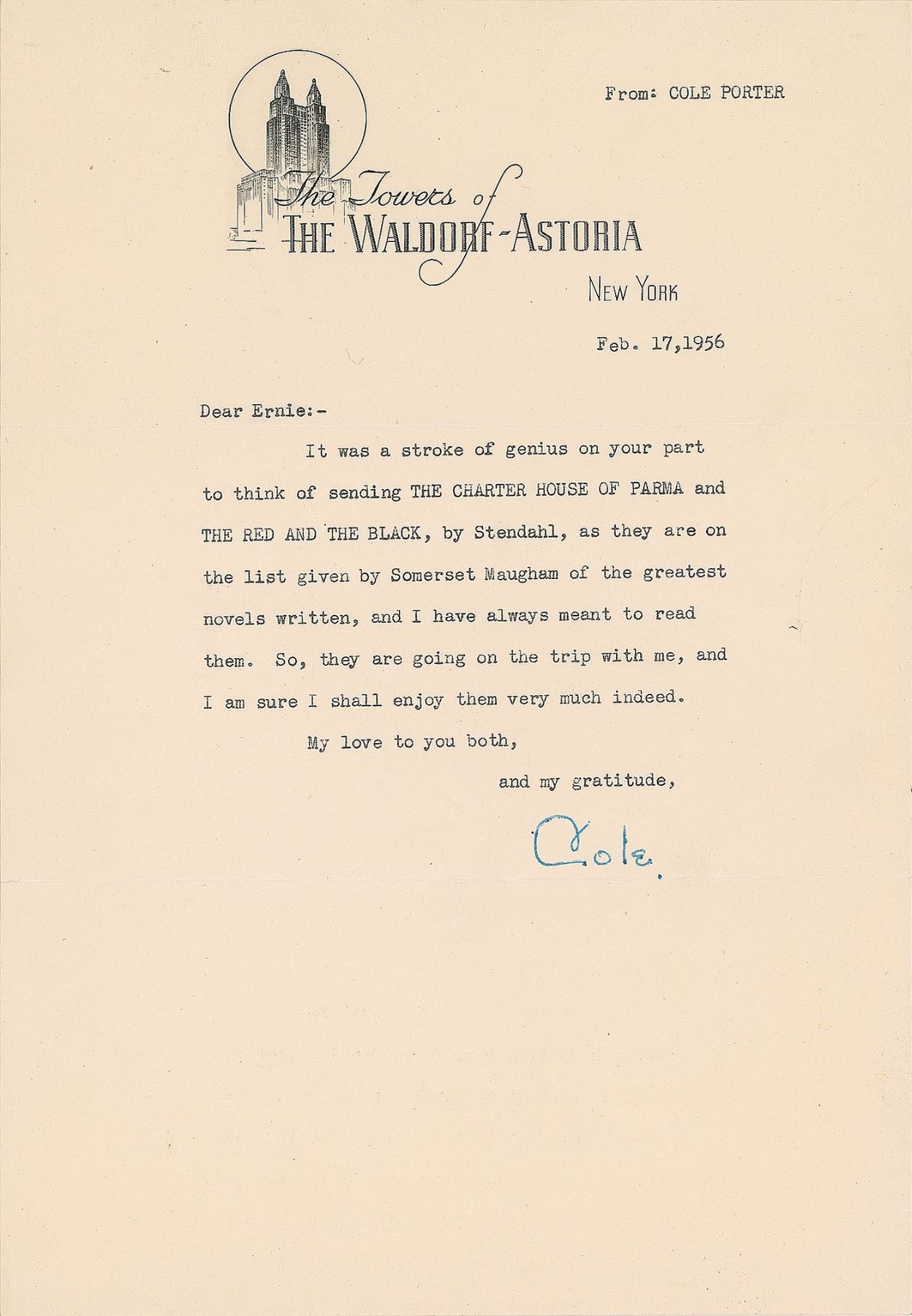 TLS signed “Cole,” one page, 7.25 x 10.5, Waldorf-Astoria letterhead, February 17, 1956. Letter to "Ernie," in part: "It was a stroke of genius on your part to think of sending The Charter House of Parma and The Red and the Black, by Stendahl, as they are on the list given by Somerset Maugham of the greatest novels written, and I have always meant to read them." In fine condition.