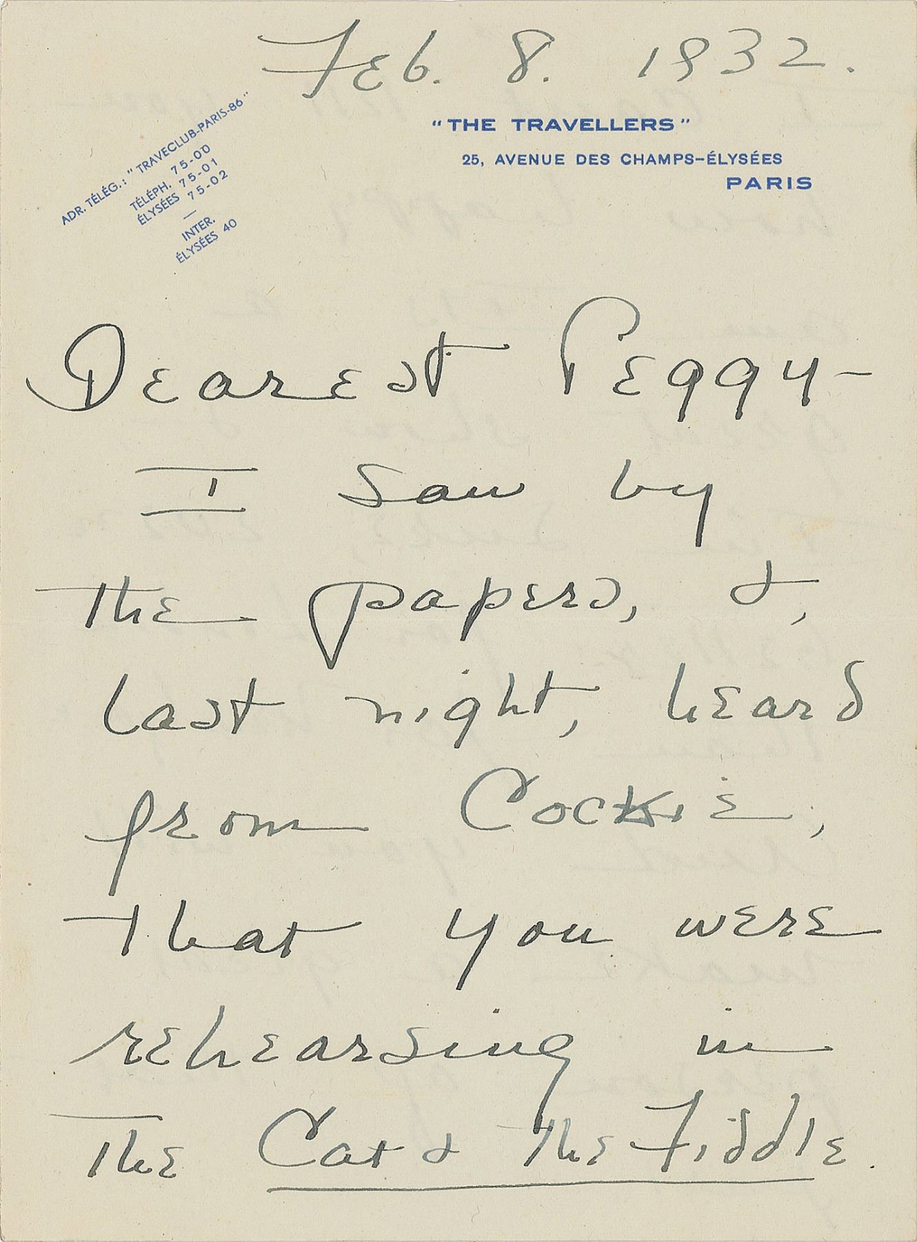 ALS signed “Cole,” two pages both sides, 5.25 x 7.25, The Travellers letterhead, February 8, 1932. Letter to singer-actress Peggy Wood, in part: "I saw by the papers, &, last night, lear'd from Cockie, that you rehearsing in the Cat & the Fiddle. I can't tell you how happy I am. It's a great show &, I'm sure, even better for London than for New York. And you will make a great person of that part. I have been so worried about you. And this is the reason I write you. For no one ever behaved as beautifully as you did during the long delays of our dead Star Dust. If I can, I shall be there to cheer you on your opening night." In fine condition. Less than a month later, on March 4, 1932, the Jerome Kern–Otto Harbach musical The Cat and the Fiddle made its London debut, with Peggy Wood playing the role of Shirley Sheridan. A fantastic musical association piece.