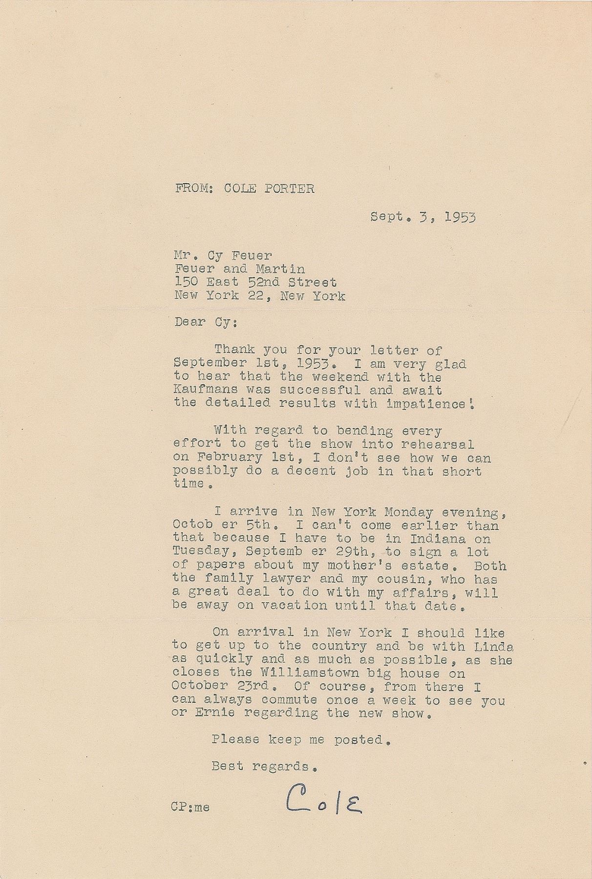 TLS signed “Cole,” one page, 7.25 x 10.75, September 3, 1953. Letter to New York theatre producer Cy Freuer, in full: "Thank you for your letter of September 1st, 1953. I am very glad to hear that the weekend with the Kaufmans was successful and await the detailed results with impatience! With regard to bending every effort to get the show into rehearsal on February 1st, I don't see how we can possibly do a decent job in that short time. I arrive in New York Monday evening, October 5th. I can't come earlier than that because I have to be in Indiana on Tuesday, September 29th, to sign a lot of papers about my mother's estate. Both the family lawyer and my cousin, who has a great deal to do with my affairs, will be away on vacation until that date. On arrival in New York I should like to get up to the country and be with Linda as quickly and as much as possible, as she closes the Williamstown big house on October 23rd. Of course, from there I can always commute once a week to see you or Ernie regarding the new show. Please keep me posted." In fine condition.