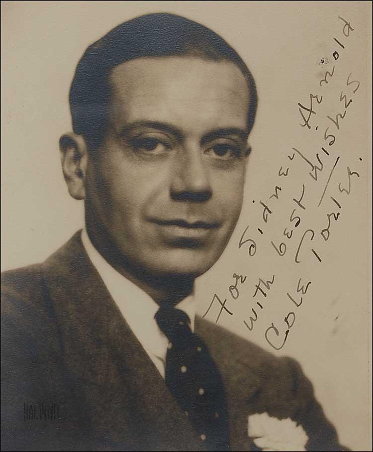 Important American composer and lyricist (1891–1964) best known for his urbane, witty lyrics and sinuous music. Vintage matte-finish 4.5 x 5.5 Hal Phyfe photo, signed and inscribed in fountain pen “For Sidney Arnold with best wishes, Cole Porter.” Double matted and framed to an overall size of 8.75 x 10. In fine condition. Pre-certified PSA/DNA and RRAuction COA.