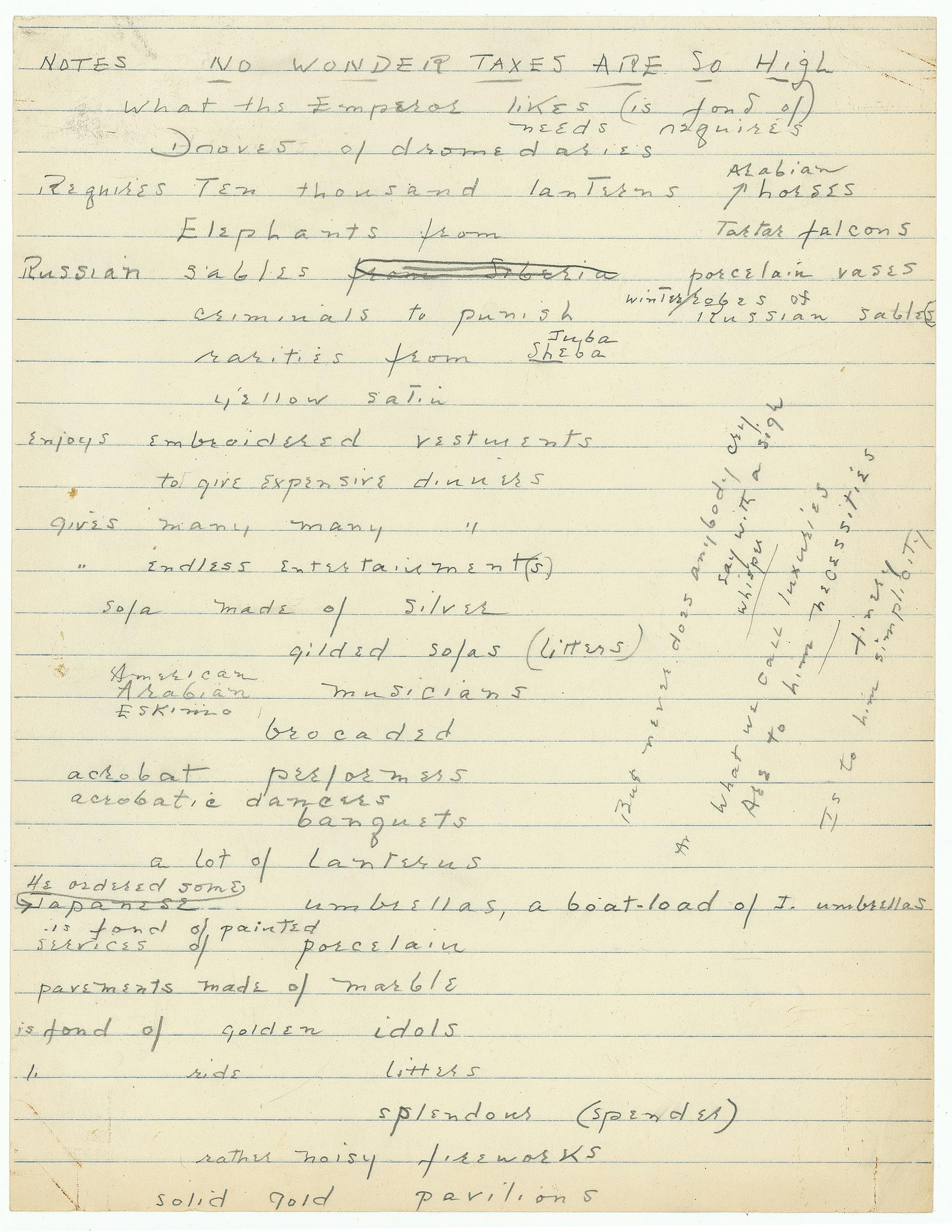 Porter’s notes, which include a number of cross-outs and emendations, employ the “list” format that had become a trademark in such songs as “Let’s Do It” and “You’re the Top.” In part: “What the Emperor likes … Droves of dromedaries … Requires ten thousand lanterns …Winter robes of Russian sables … Criminals to punish … Rarities from Sheba … Enjoys embroidered vestments … To give expensive dinners … Gives many many expensive entertainments … Sofa made of silver … Is fond of painted services of porcelain … Pavements made of marble … Is fond of golden idols … Rather noisy fireworks … Solid gold pavilions….”