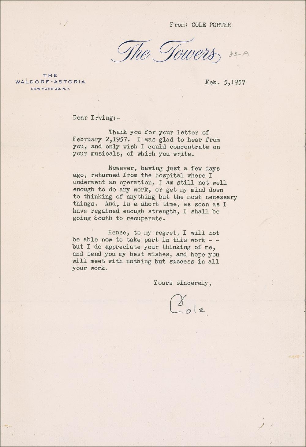 TLS signed “Cole,” one page, 7.25 x 10.5, The Towers letterhead, February 5, 1957. Letter to fellow composer Irving Schlein. In part: “I was glad to hear from you, and only wish I could concentrate on your musicals…However, having just a few days ago, returned from the hospital where I underwent an operation, I am still not well enough to do any work…Hence to my regret, I will not be able to take part in this work-but I do appreciate your thinking of me…and hope you will meet with nothing but success in all your work.” In fine condition, with a horizontal fold through top of first letter of signature, and some light creasing and wrinkling.