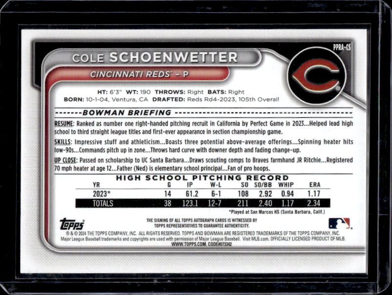 Cole Schoenwetter 2024 Bowman Paper Prospects Auto #PPRA-CS