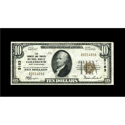 <B>Colebrook, NH</B></I> - $10 1929 Ty. 1 <B>The Farmers & Traders NB</B></I> Ch. # 5183<BR>A crispy and well centered <B>Very Fine+</B></I> from the second of the two banks to issue the 1929 series from here, this institution confining its order to the $10 denomination in both Types 1 and 2. The census includes 20 small size notes from here. This one enjoys considerable Eye appeal and should sell in the range of...
