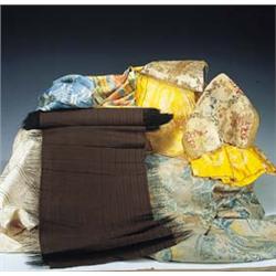 Colección de textiles de los siglos XVII al XX Lote de 6 fragmentos en seda adamascada en distintos tonos, S.XIX Medidas entre 164 x 180 cms. y 43 x 39 cms. Formado por un fragmento en tonos azul pálido y naranja; uno en tonos celestes, amarillos, verdes, azules y rosas; uno de época Imperio en azul y blanco; dos para talla de vestir con galón antiguo, en azul claro y plata y beige y dorada respectivamente, y el último en tonos rosas, celestes y platas. Faltas y manchas.