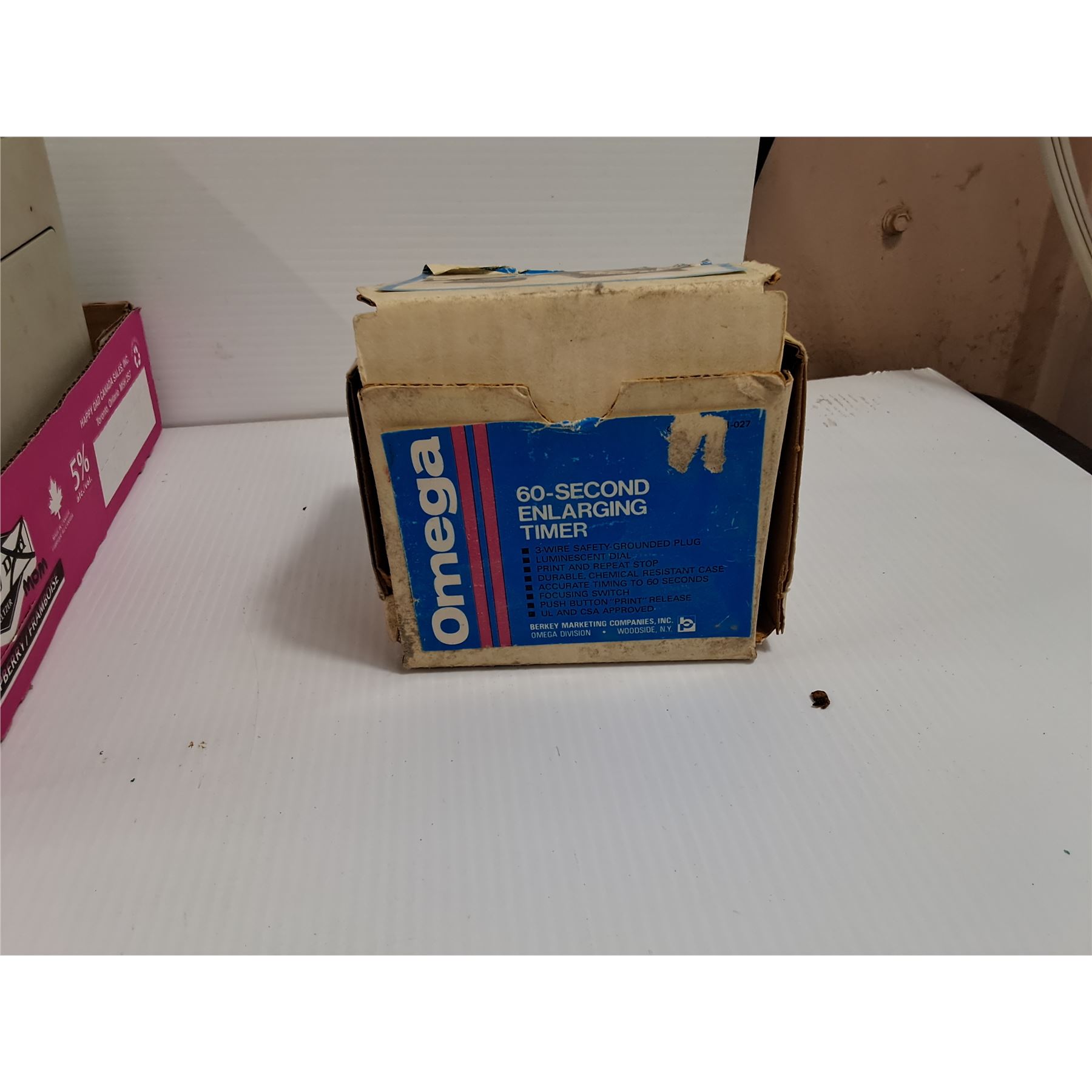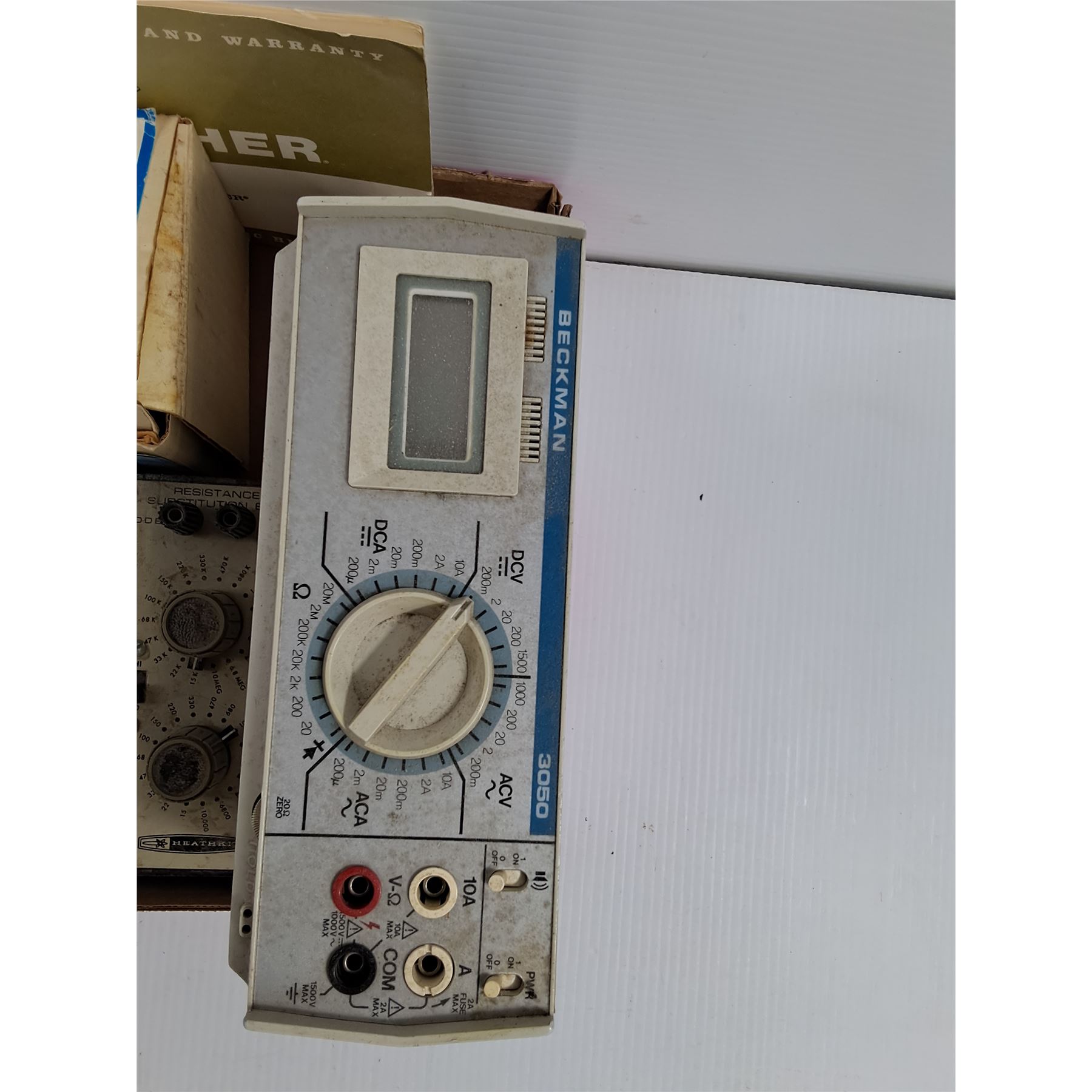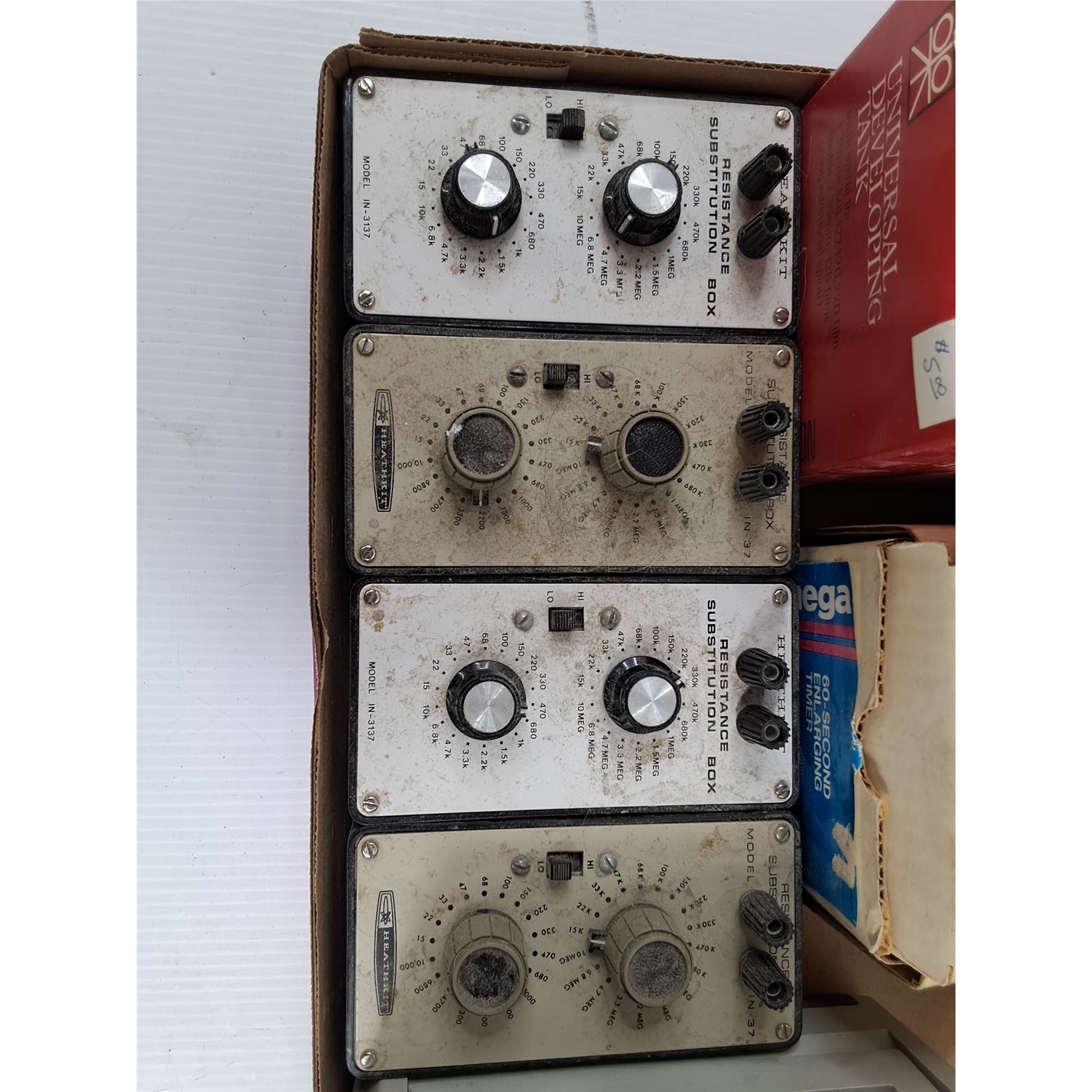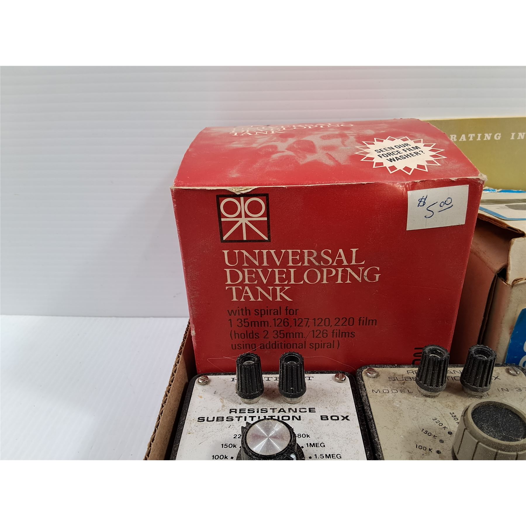 Contains Film Developing Tank With Manual In Box, (4) Vintage Resistance Substitution Box, Beckman Vintage Digital Multimeter No Cords Included, One Minute Vintage Omega Electric Plug In Timer