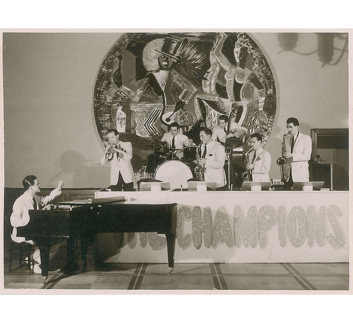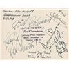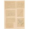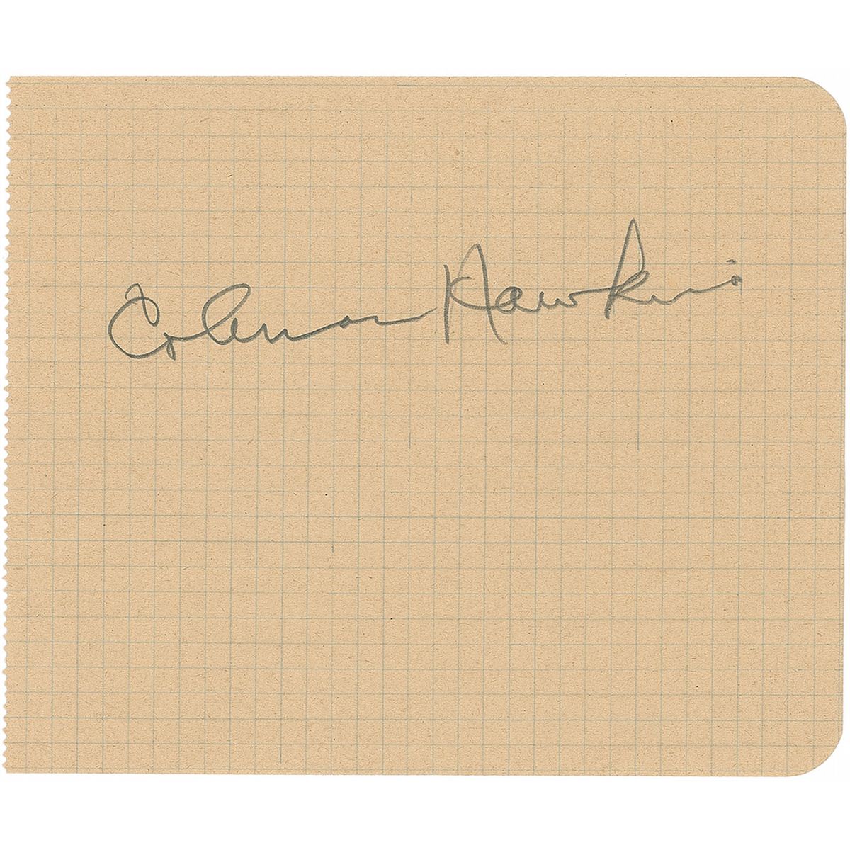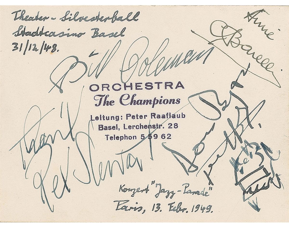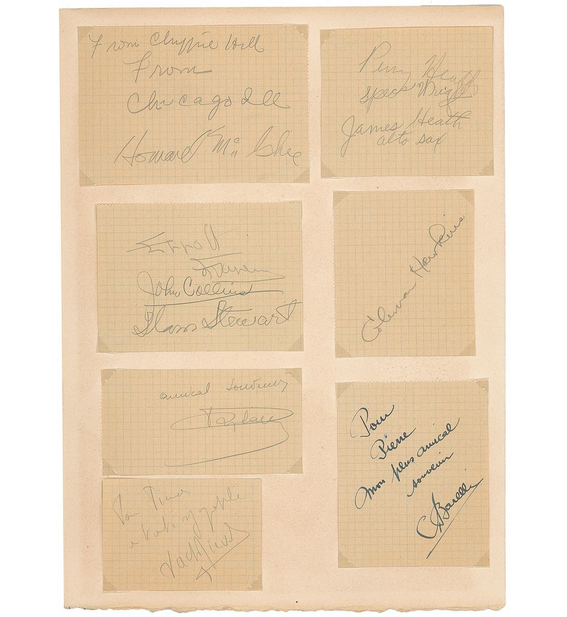 Two pencil signatures, “Coleman Hawkins,” one on a full off-white 5.25 x 4.25 album page and the other on a trimmed 3 x 3.5 slip. Also includes ink and pencil signatures on various slips and cards of Aime Barelli, John Collins, Jack Dieval, Erroll Garner, James and Percy Heath, Bertha ‘Chippie’ Hill, Howard McGhee, Hubert Rostaing, and Slam Stewart. Most are removably corner-mounted inside the back cover of a program for La Grande Semaine du Jazz at the Theatre Marginy in May 1948. In overall fine condition, with some foxing and toning to covers of the program.