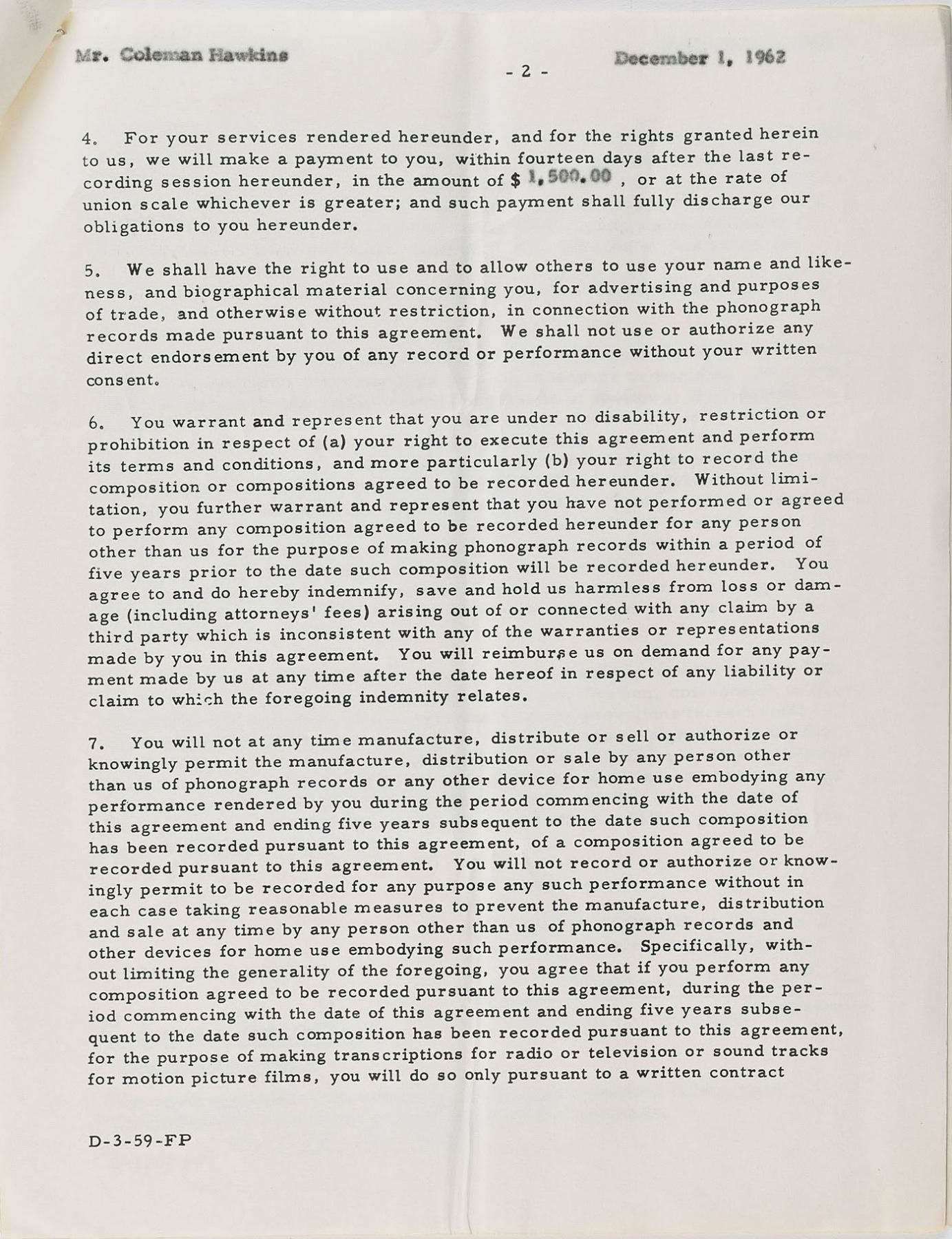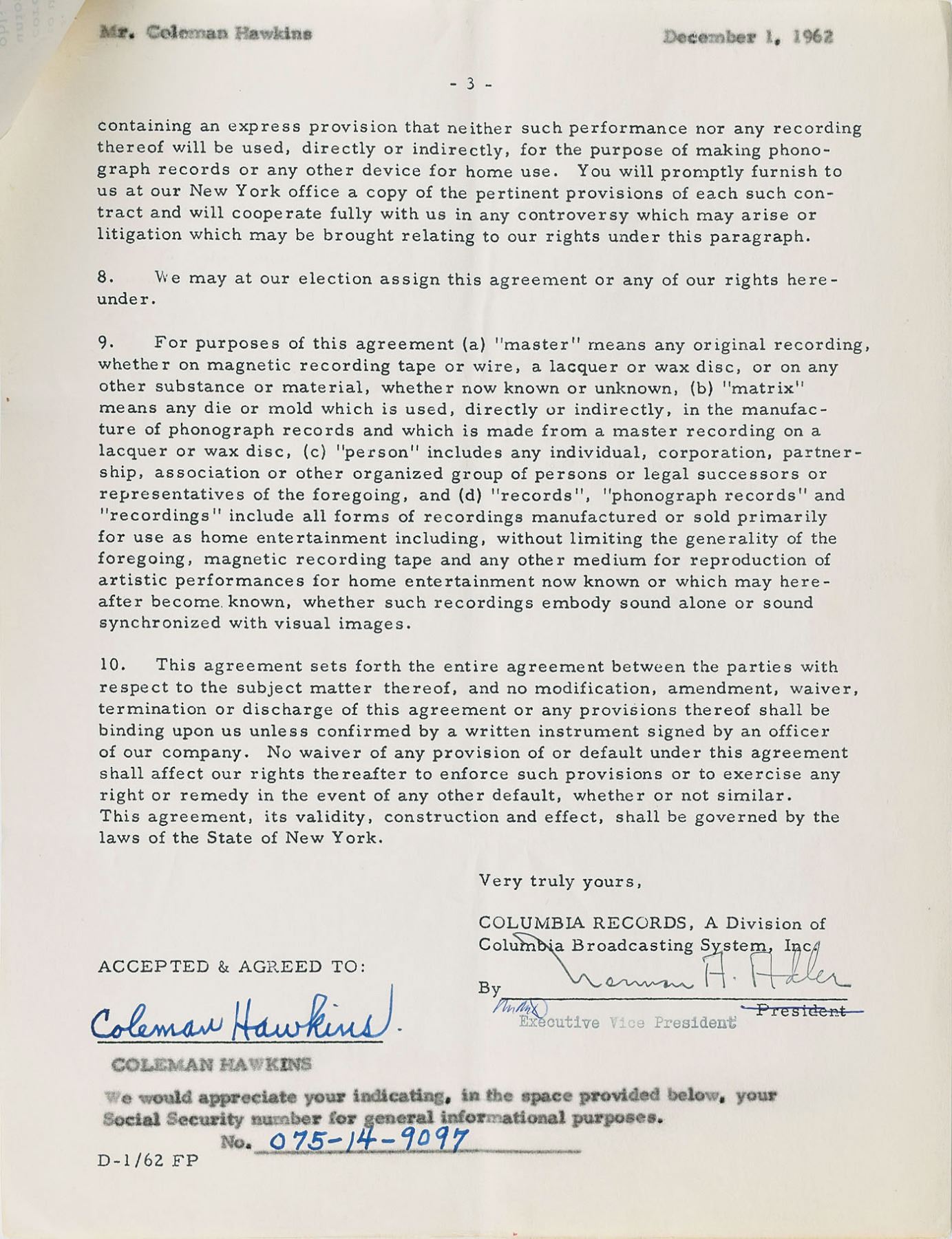 American jazz tenor saxophonist (1904-1969), nicknamed 'Hawk' and occasionally 'Bean,' who was strongly associated with the swing music and big band era, and played a role in the development of bebop in the 1940s. Sought-after DS, three pages, 8.5 x 11, December 1, 1962. Contract between Columbia Records and Coleman Hawkins in which the latter agrees to render his services "with Clark Terry at a recording session, or sessions…on such dates during December 1962" and record a "Minimum of six compositions." Signed at the conclusion in blue ink by Hawkins, who adds his social security number below. In very good to fine condition, with scattered light creasing, and intersecting folds.