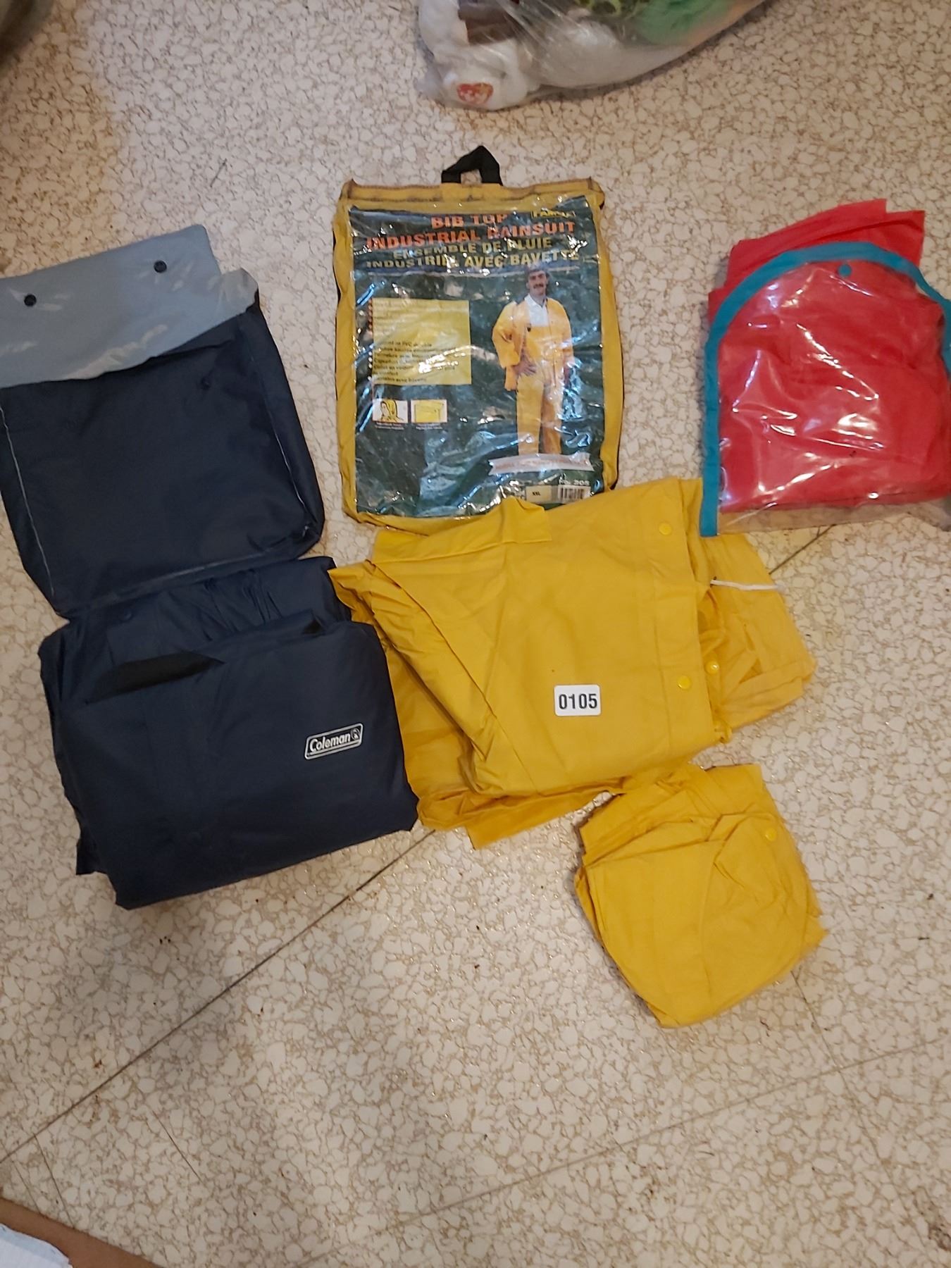 Coleman Rain Jacket (brand new, size 3XL), Bib Top rainsuit (size XXL), red poncho