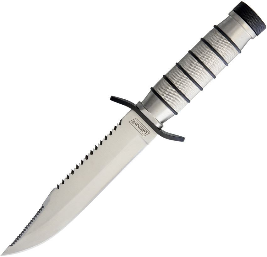 9.5" overall. 5.25" satin finish stainless clip point blade. Aluminum handle. Stainless guard. Sawback blade. Hollow handle holds survival kit with threaded end cap. Black nylon belt sheath