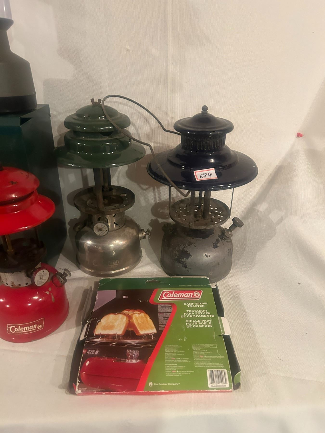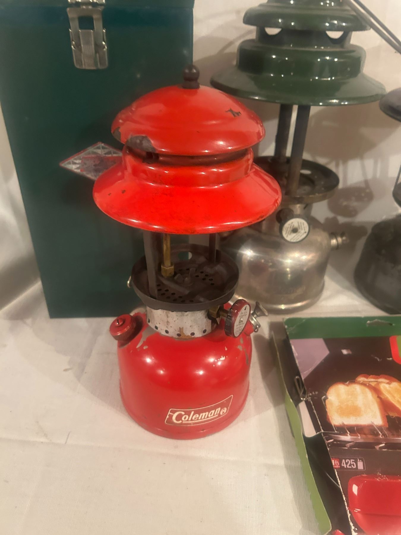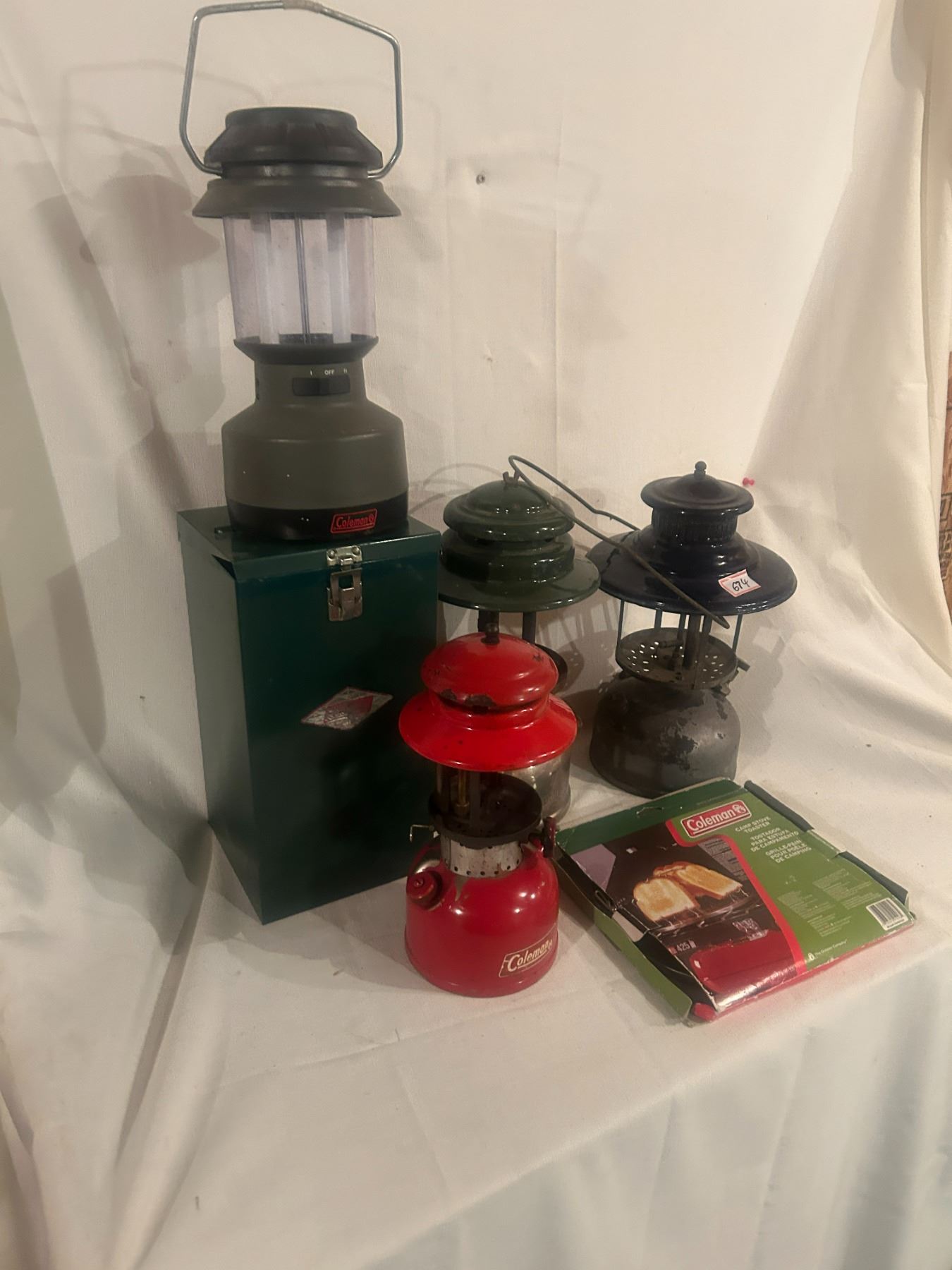 Coleman lanterns, metal case and toaster - 3 lamps missing globes