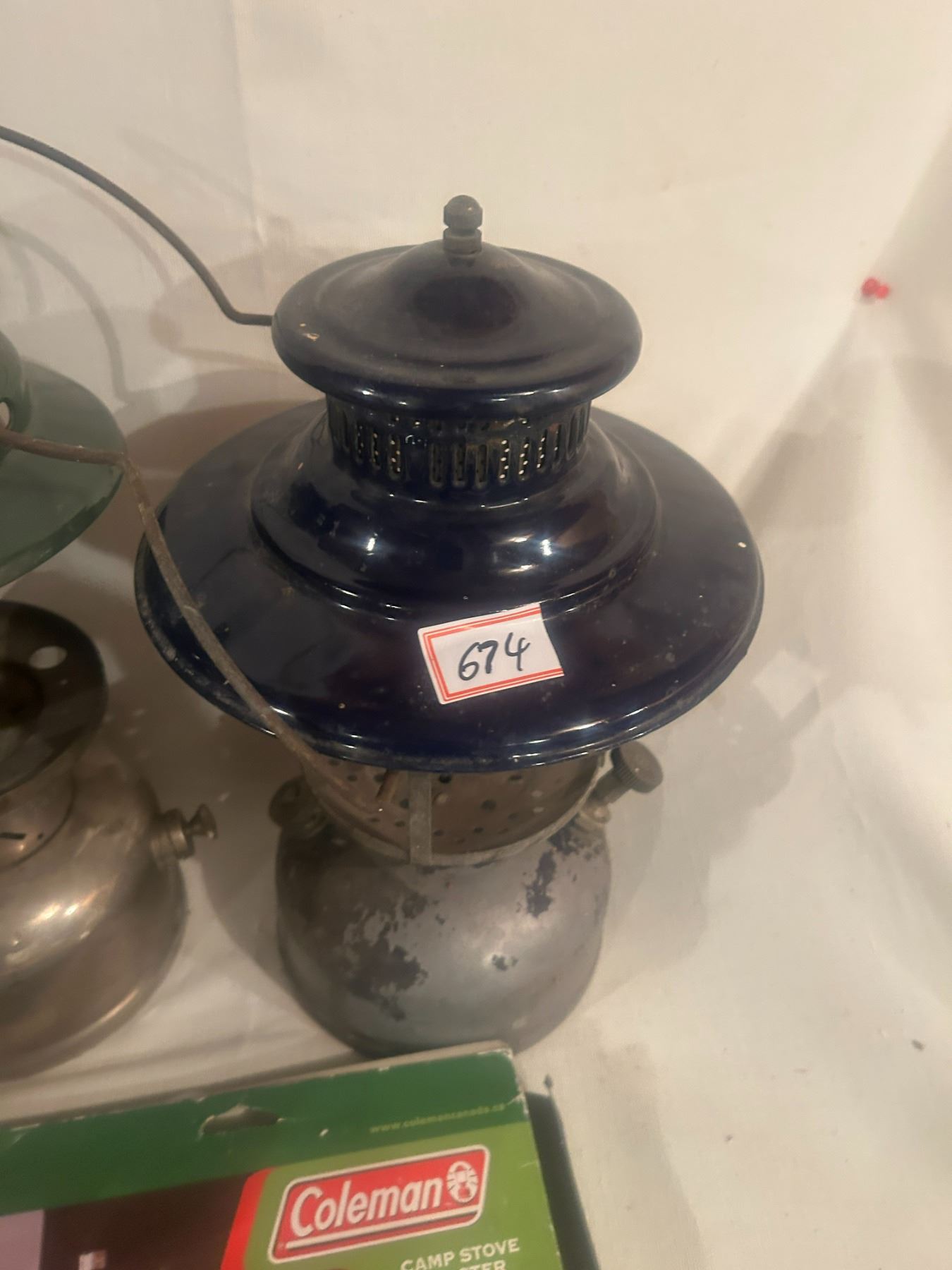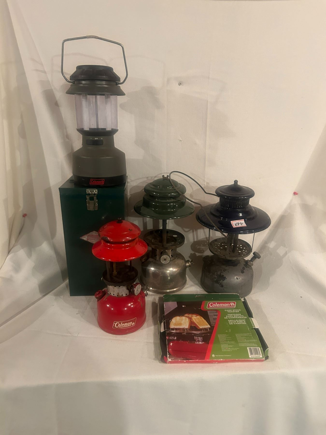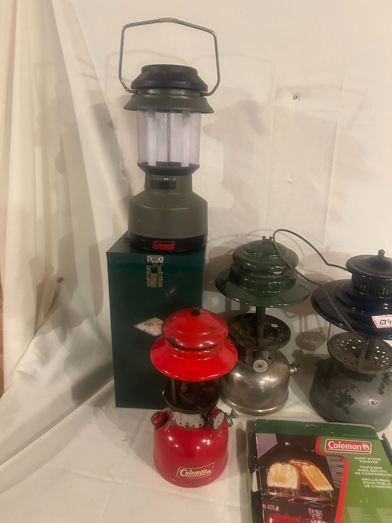 Coleman lanterns, metal case and toaster - 3 lamps missing globes