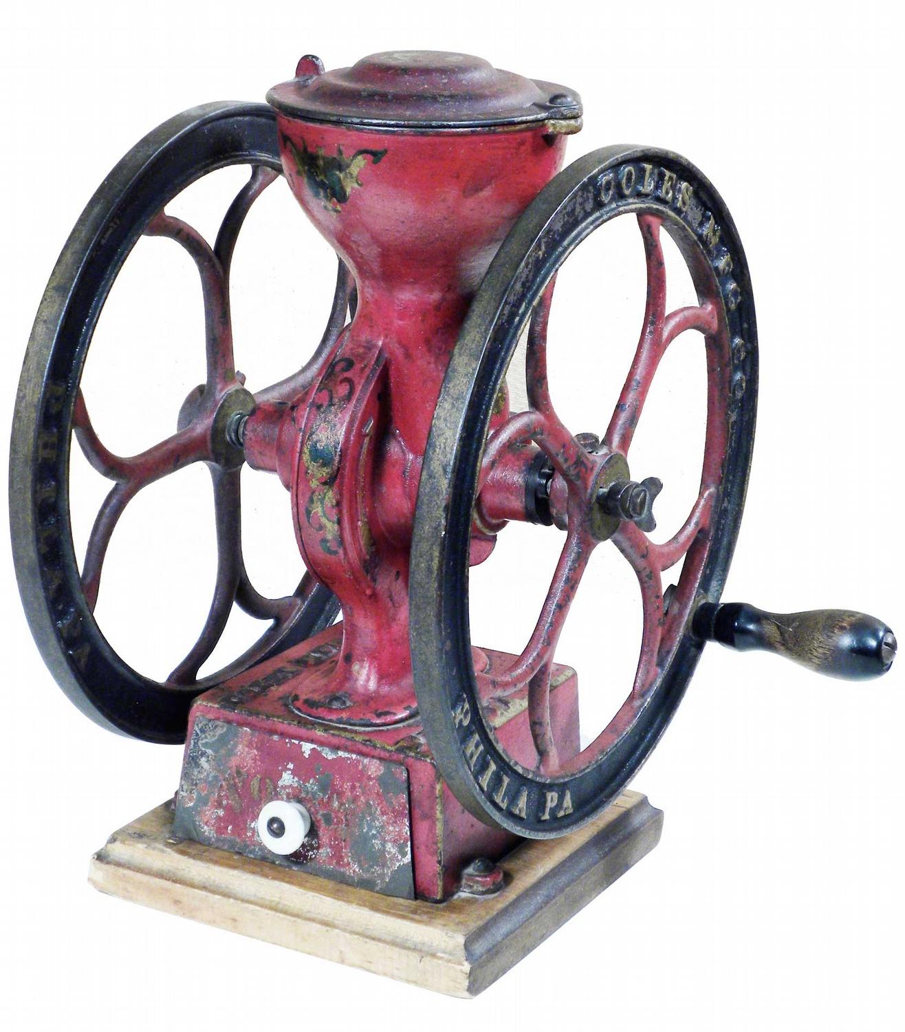 Coles Mfg. Co. Small Coffee Grinder, Philadelphia, PA. Very good original condition. 9 3/4 inch wheel. 12 inches tall.