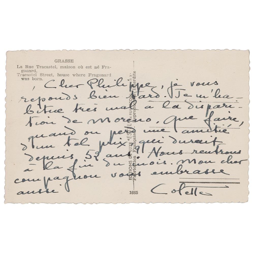 Untranslated ALS in French, signed ‰ÛÏColette,‰Û one page on a 5.5 x 3.5 postcard depicting the rue Tracastel, no date. In fine condition.