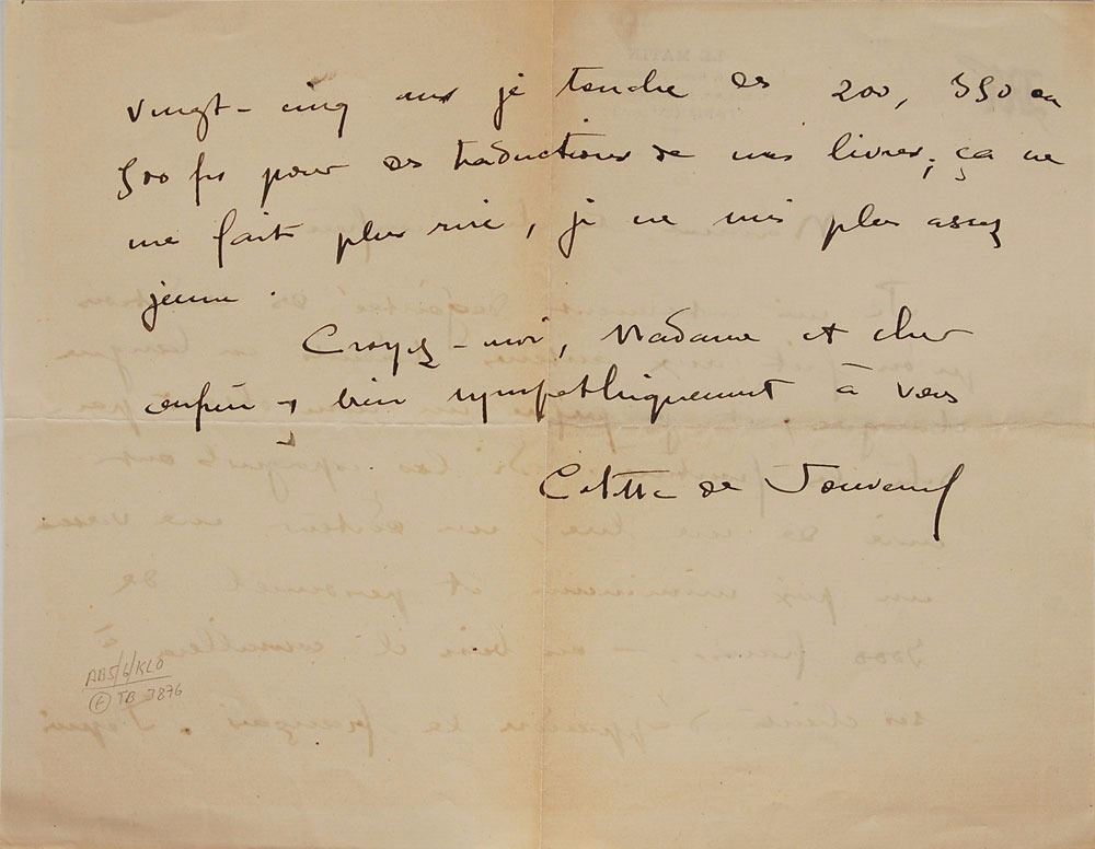 The daughter of French writer Colette and her second husband, Henri de Jouvenel. Untranslated ALS in French, one page both sides, 10.5 x 8.25, Le Matin letterhead, no date. In fine condition.