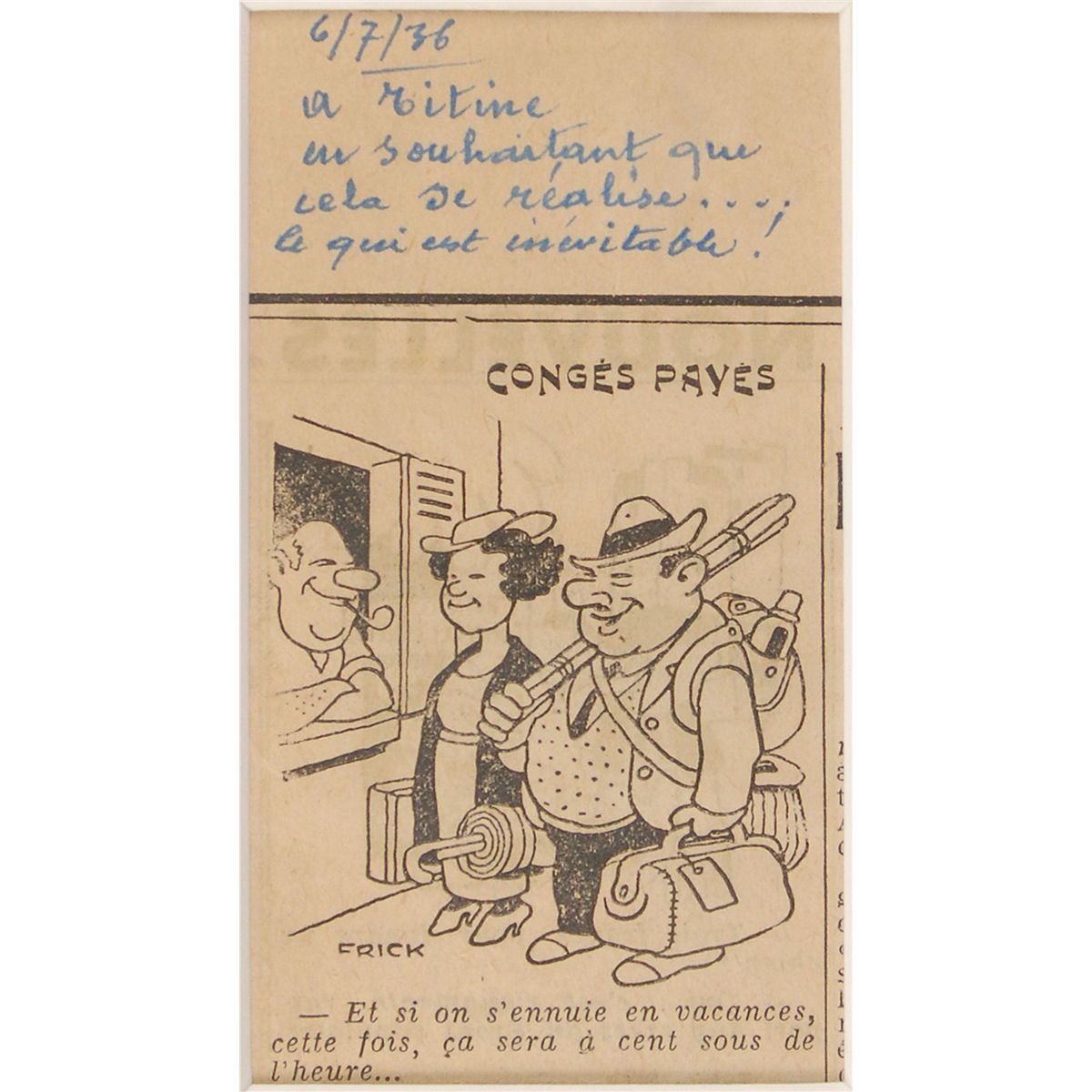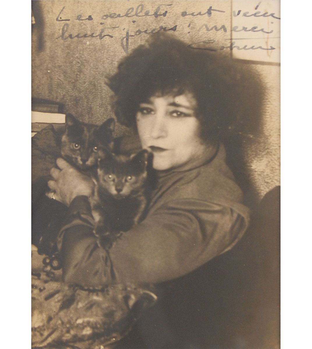 Pen name of the French novelist Sidonie-Gabrielle Colette (1873–1954), best known for such works as the Claudine series, La Chatte, and Gigi. Rare vintage matte-finish 3.75 x 5.25 photo of Colette with her two cats, signed in fountain pen in French [translated], “The carnations lived eight days! Thank you, Colette.” A cartoon clipped from a French newspaper is affixed to the reverse, upon which Colette added an inscription, “6/7/36, To Ritine, Wishing you that this may come true… which is inevitable!” Double-matted and framed to an overall size of 11.25 x 12.75. In fine condition. Colette published a short novel entitled La Chatte [The Cat] in 1933, which tells the story of a love triangle involving Camille Malmert, her husband Alain Amparat, and his Chartreux cat Saha; the cat in the story was based upon Colette’s own pet. An exceptionally desirable photograph with a nice connection to her life and work.