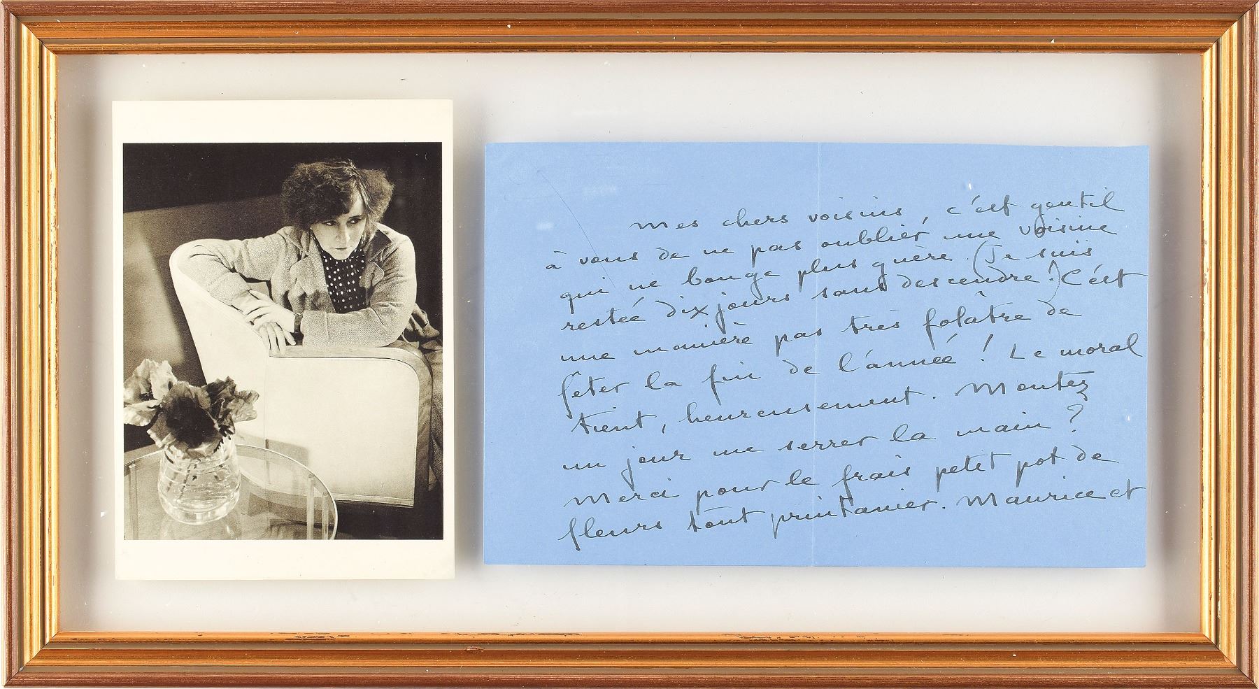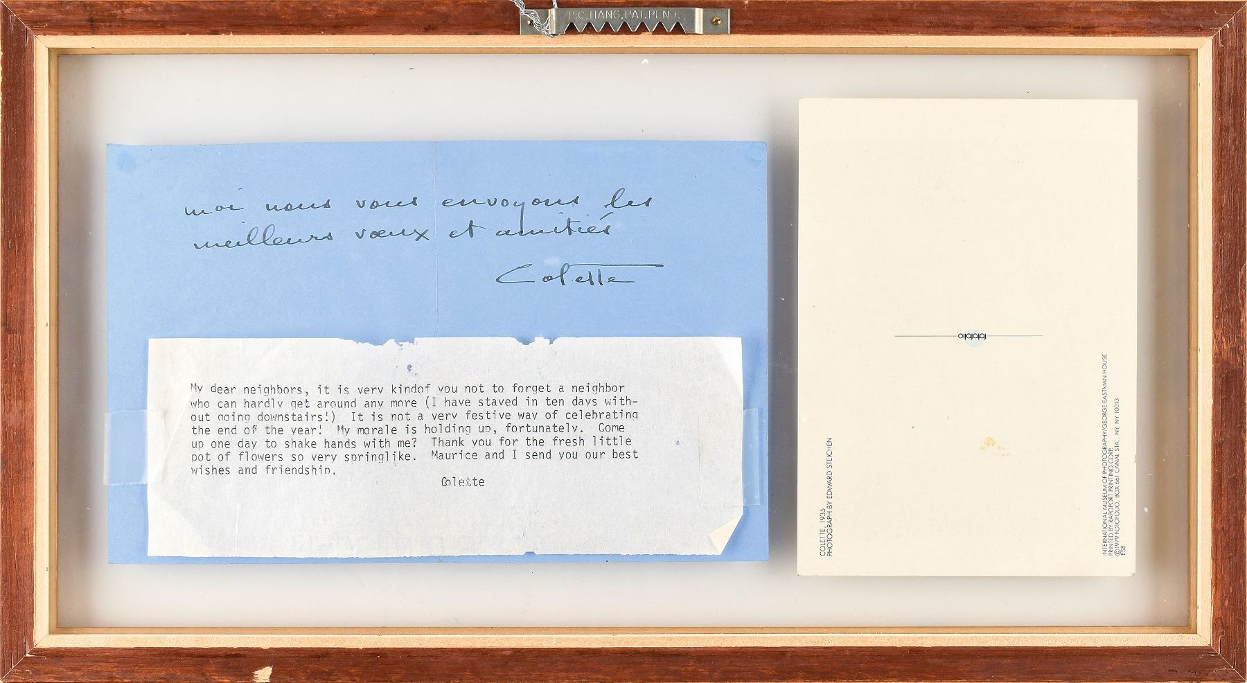 Pen name of the French novelist Sidonie-Gabrielle Colette (1873–1954), best known for such works as the Claudine series, La Chatte, and Gigi. ALS in French, signed “Colette,” one page both sides, 8.25 x 5.25, no date. Letter to "my dear neighbors," in full (translated): "It is very kind of you not to forget neighbor who can hardly get around any more (I have stayed in ten days without going downstairs!) It is not a very festive way of celebrating the end of the year! My morale is holding up, fortunately. Come up one day to shake hands with me? Thank you for the fresh little pot of flowers so very spring-like. Maurice and I send you our best wishes and friendship." Framed with a portrait and Plexiglas on both sides to an overall size of 15.5 x 8.5. In fine condition.