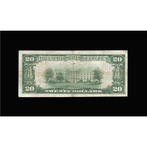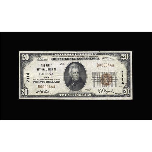 <B>Colfax, IA</B></I> - $20 1929 Ty. 1 <B>The First NB</B></I> Ch. # 7114<BR>This <B>Fine-Very Fine</B></I> $20 has not been accounted for before now. It joins its 7 Small siblings in the census as the finest graded small note from this Jasper County bank. H.E. Bell and F.E. Boyd liquidated this bank on June 24, 1933. A light ink line from a teller stamp is noticed to the left of the portrait.