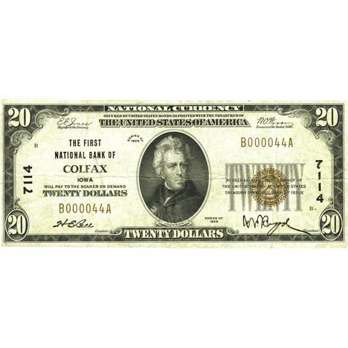 <B>Colfax, IA</B></I> - $20 1929 Ty. 1 <B>The First NB</B></I> Ch. # 7114<BR>This <B>Very Fine</B></I> note is one of only five of this type and denomination known from this scarce issuer in Jasper County. While two issuers were located here, this bank, which failed in 1933, was the only one to order the Type 1 design.