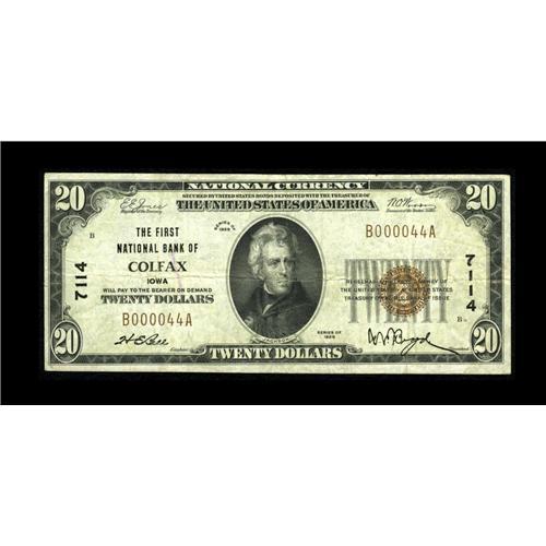 <B>Colfax, IA</B></I> - $20 1929 Ty. 1 <B>The First NB</B></I> Ch. # 7114<BR>This small Jasper County community is represented in the census by just four large and eight small notes, including this attractive and quite crisp <B>Very Fine.</B></I> A one time tourist center until its mineral water deposits ran dry, this locale was named after President Grant's Vice-President, Schuyler Colfax..<BR><BR><b>Shipping:</b> Coin/Currency (<a target="_blank" href="http://www.heritageauctions.com/common/shipping.php">view shipping information</a>)