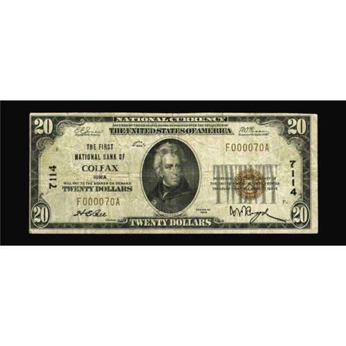 <B>Colfax, IA</B></I> - $20 1929 Ty. 1 <B>The First NB</B></I> Ch. # 7114<We offer the second of five of the $20 Type 1 notes documented in the Kelly census from this small Jasper County locale. <B>Very Good-Fine.</B></I> We anticipate bidding will reach a level of no less than...