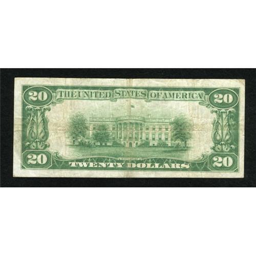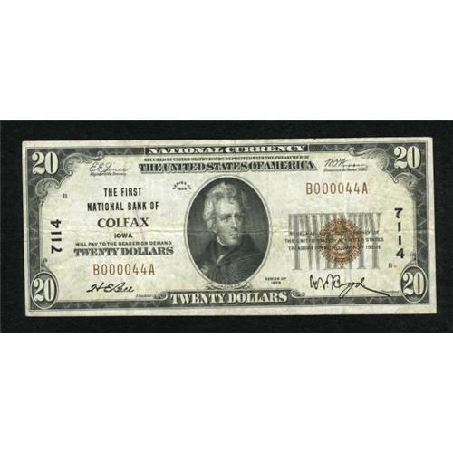 <B>Colfax, IA</B></I> - $20 1929 Ty. 1 <B>The First NB</B></I> Ch. # 7114<BR> This <B>Fine-Very Fine</B></I> $20 is one of 11 small in the census. H.E. Bell and F.E. Boyd liquidated this bank on June 24, 1933. A light ink line from a teller stamp is noticed to the left of the portrait.<BR><BR><b>Shipping:</b> Coins & Currency (<a target="_blank" href="http://www.heritageauctions.com/common/shipping.php">view shipping information</a>)