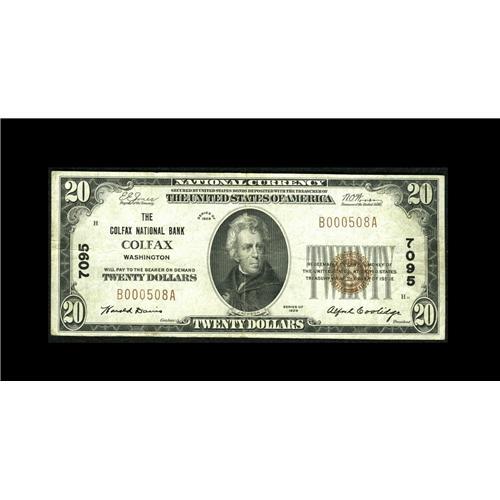 <B>Colfax, WA</B></I> - $20 1929 Ty. 1 <B>The Colfax NB</B></I> Ch. # 7095<BR>A solid <B>Very Fine</B></I> from an issuer that ceased operating in January of 1932.
