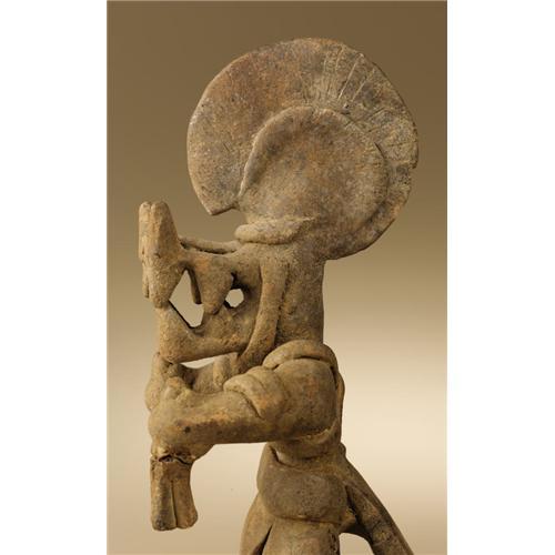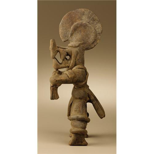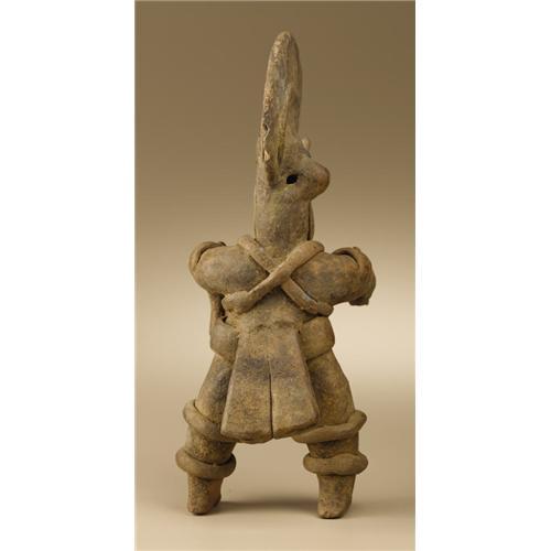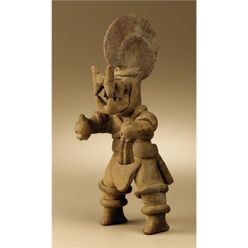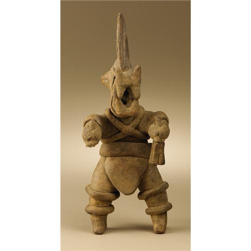 <B>Masked Dancer</B></I><BR>Colima<BR>200 B.C. - A.D. 200<BR>Buff ceramic<BR>Height 10 1/2 in. Width 4 in.<BR><BR>A number of Colima figures of this exact iconography are known, including a large example in the Dallas Museum of Art. The costumed dancer wears a mask having a large, strongly projecting squared snout with prominent fanglike teeth. The nose is tipped by pointed, upthrust elements. A strap-held helmet develops into a large circular feathered fan not unlike headdresses worn by contemporary <I>quetzales</B></I> dancers of southeast Mexico. A two-part tailpiece fans rearward from the broad waist belt, balanced in front by a triangular flap. Crossed bands on the torso and double banding of the arms and legs complete the costume. The outstretched arms end in hands clasping four-part flexible dance wands, the right one missing and the left reglued. A whistle is incorporated in the head, with the mouthpiece where a right ear would be. The rear flap was broken off halfway down and has been reglued. Other than minor stains and chips, the condition is good.<BR><BR>Provenance<BR>Dave DeRoche, Piedmont, California<BR><BR>