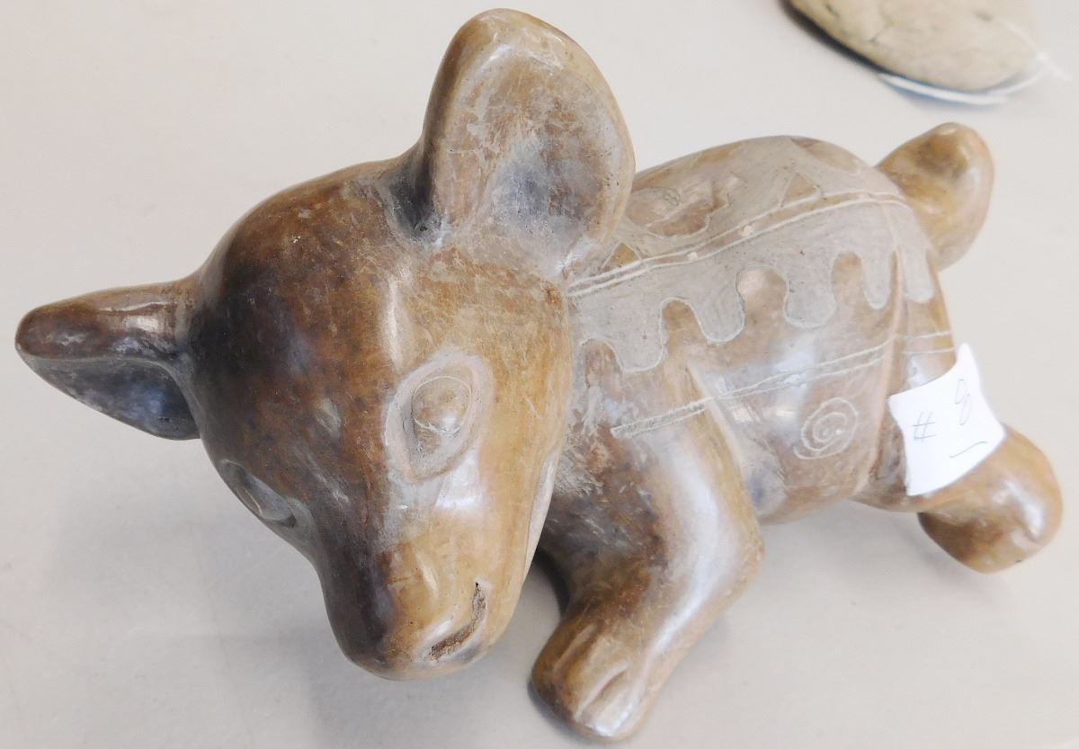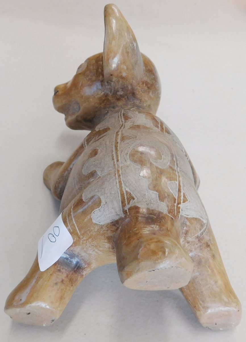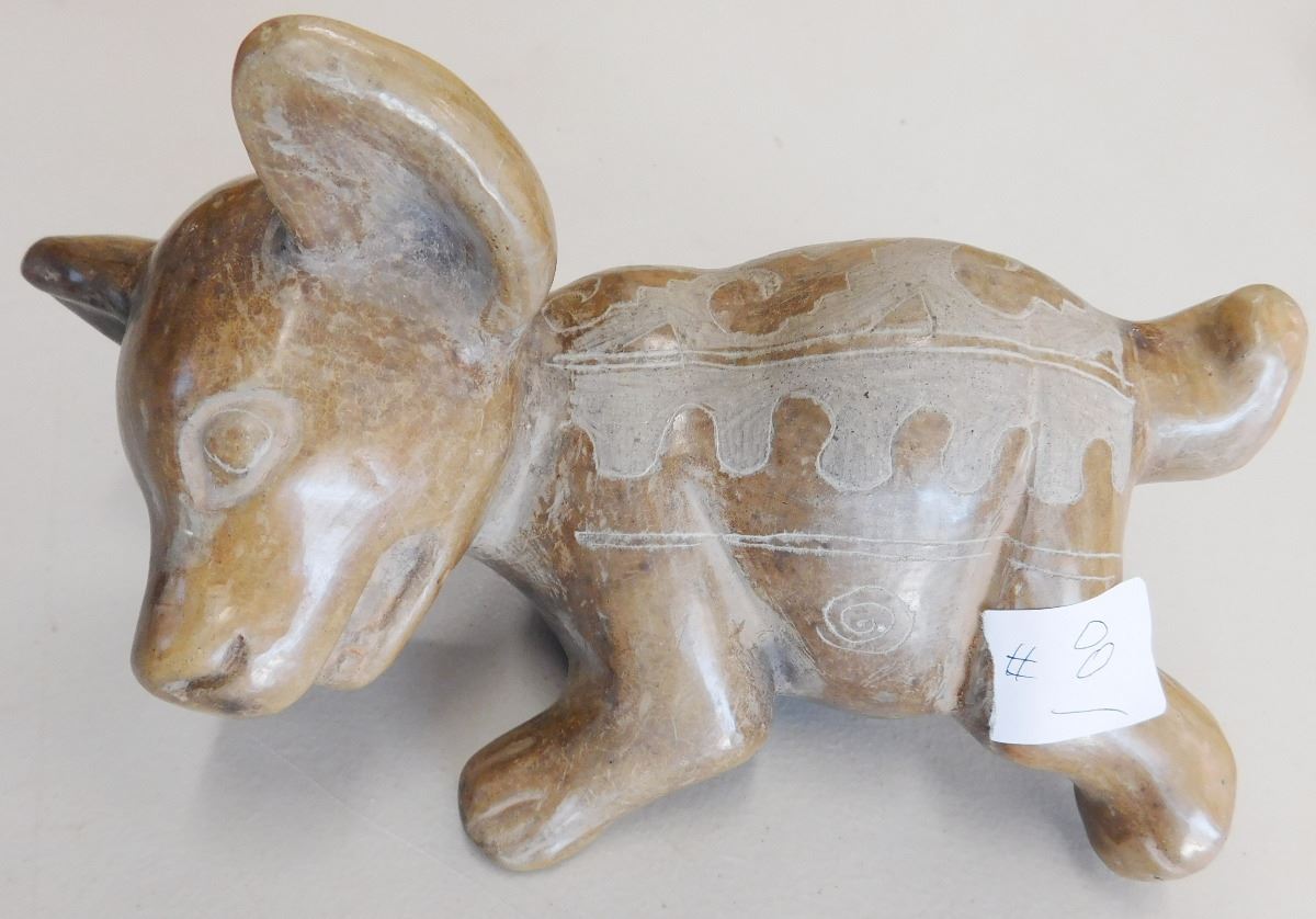 Colima Dog, modern item. Made of clay and carved, this item is 5" x 5" x 10". From Colima, Mexico. Nice engraving on dog, appears to be playing with a nice expression. Condition: Very good, see images. Shipping: $24.00, requires double box.