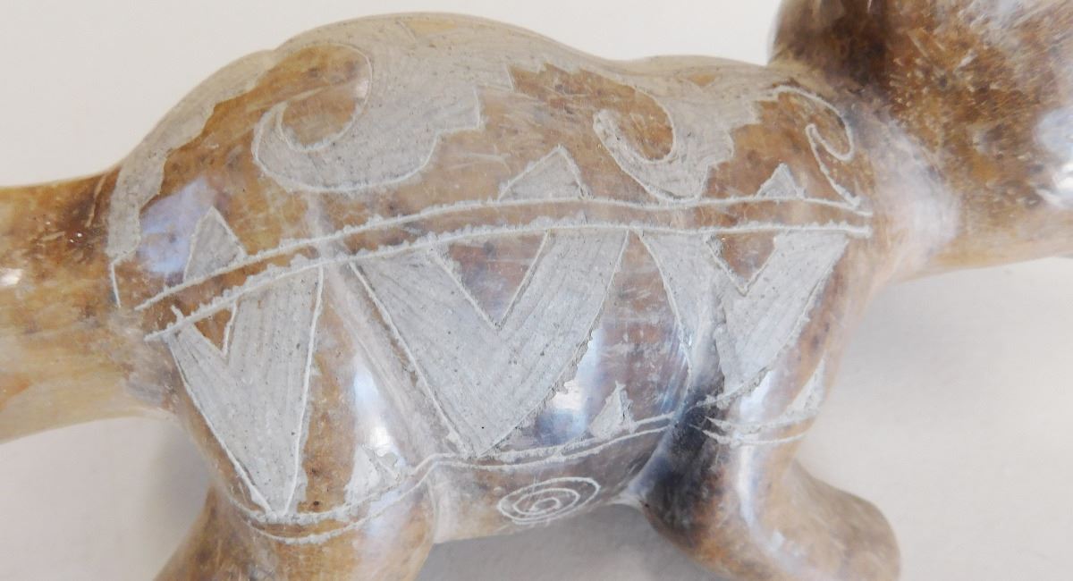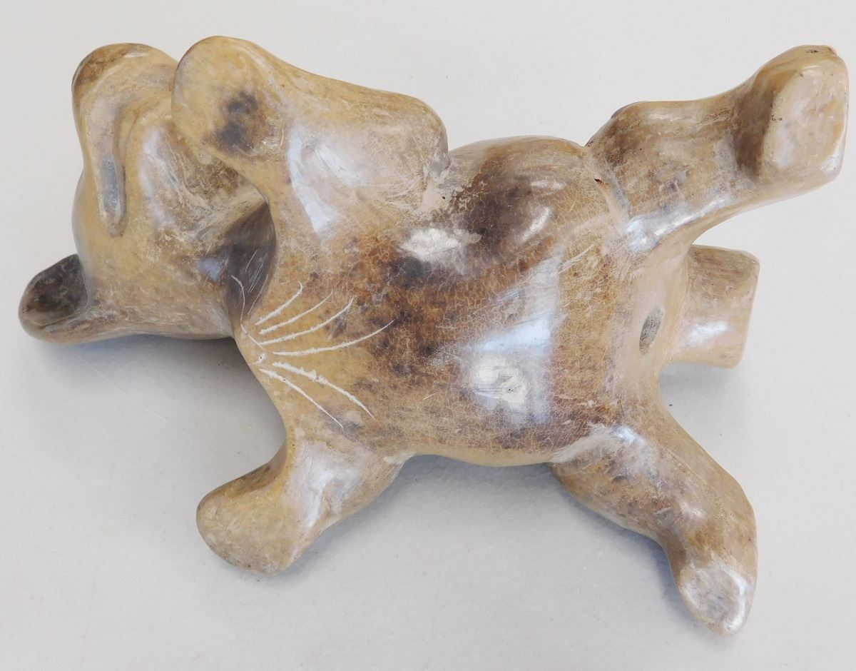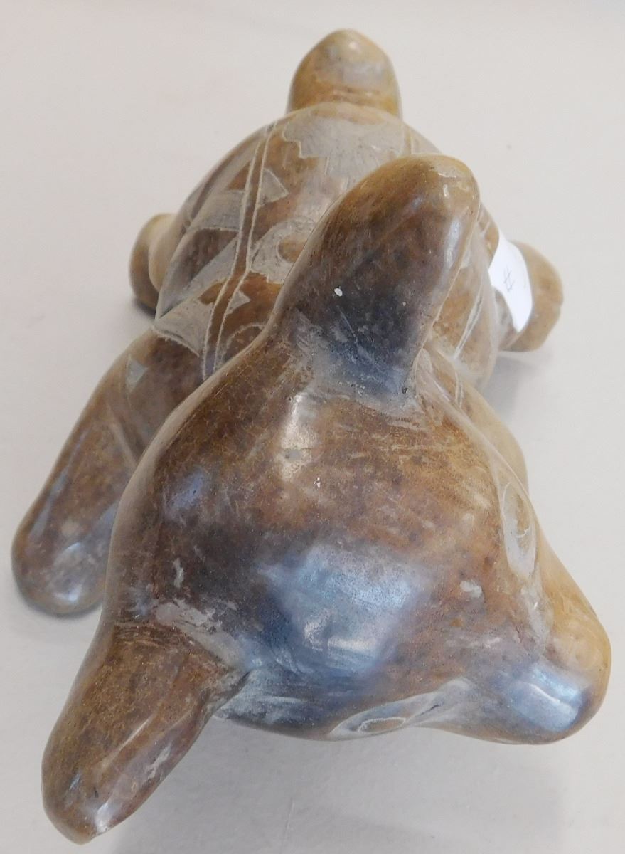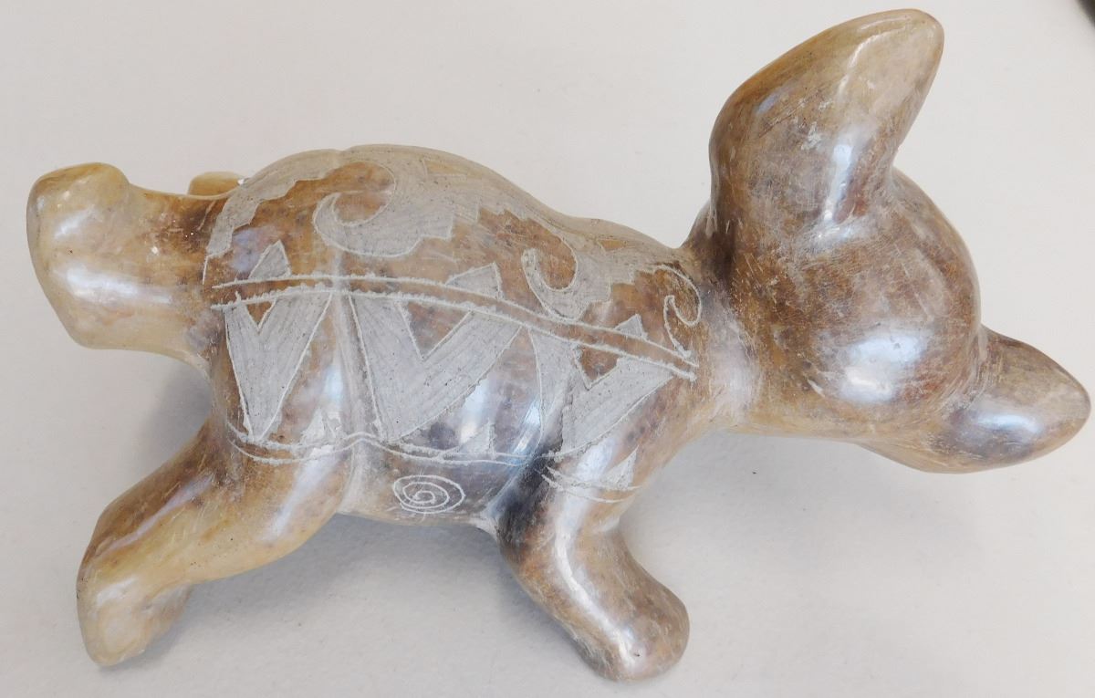 Colima Dog, modern item. Made of clay and carved, this item is 5" x 5" x 10". From Colima, Mexico. Nice engraving on dog, appears to be playing with a nice expression. Condition: Very good, see images. Shipping: $24.00, requires double box.