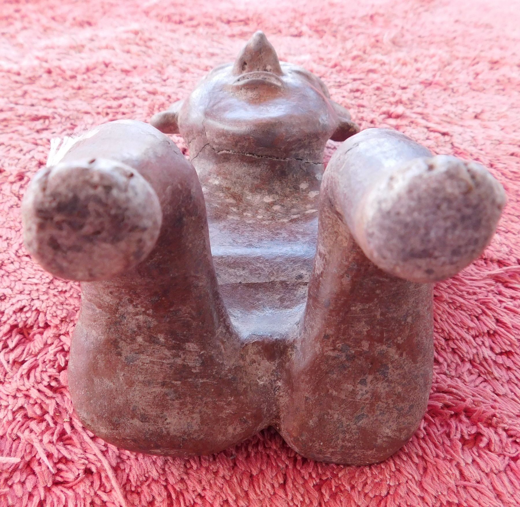 Colima Figure w/Spots, pre-Columbian item. Made of clay and paint, the item measures 5.25" x 7.5" x 3.5". Colima, Mexico. From an old, 1960s California collection. Condition: As found, cracks, see images. Shipping: $24.50 w/insurance and signature.