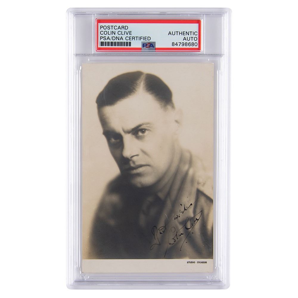Vintage matte-finish 3.25 x 5.25 postcard photo of the Frankenstein actor, signed in fountain pen, "Best wishes, Colin Clive." In very fine condition. Encapsulated in a PSA/DNA authentication holder.