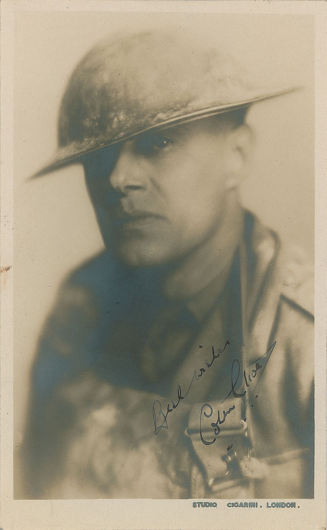 British actor (1900-1937) who earned a place in film history for his performances as Dr. Henry Frankenstein in Frankenstein and Bride of Frankenstein. Vintage sepia matte-finish 3.25 x 5.5 postcard photo of Clive as Capt. Denis Stanhope in the 1930 film Journey's End, signed in fountain pen, "Best wishes, Colin Clive." In fine condition, with faint silvering to darker areas of the image.