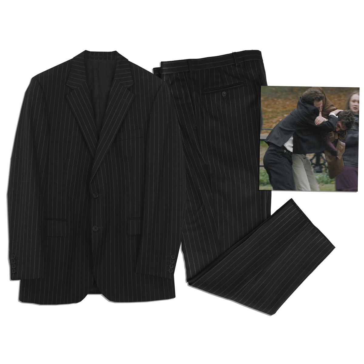 Colin Firth costume from ''Bridget Jones: The Edge of Reason''. Firth reprises his role in the sequel to ''Bridget Jones' Diary'' as her love interest Mark Darcy. Custom black pinstriped suit ensemble from the scenes where he fights for her release from jail in Thailand are by Gieves and Hawkes and comprises a single-breasted suit jacket in approximate size 42 and matching trousers in size 33 x 31. Near fine. With a COA from the Prop Store London.
