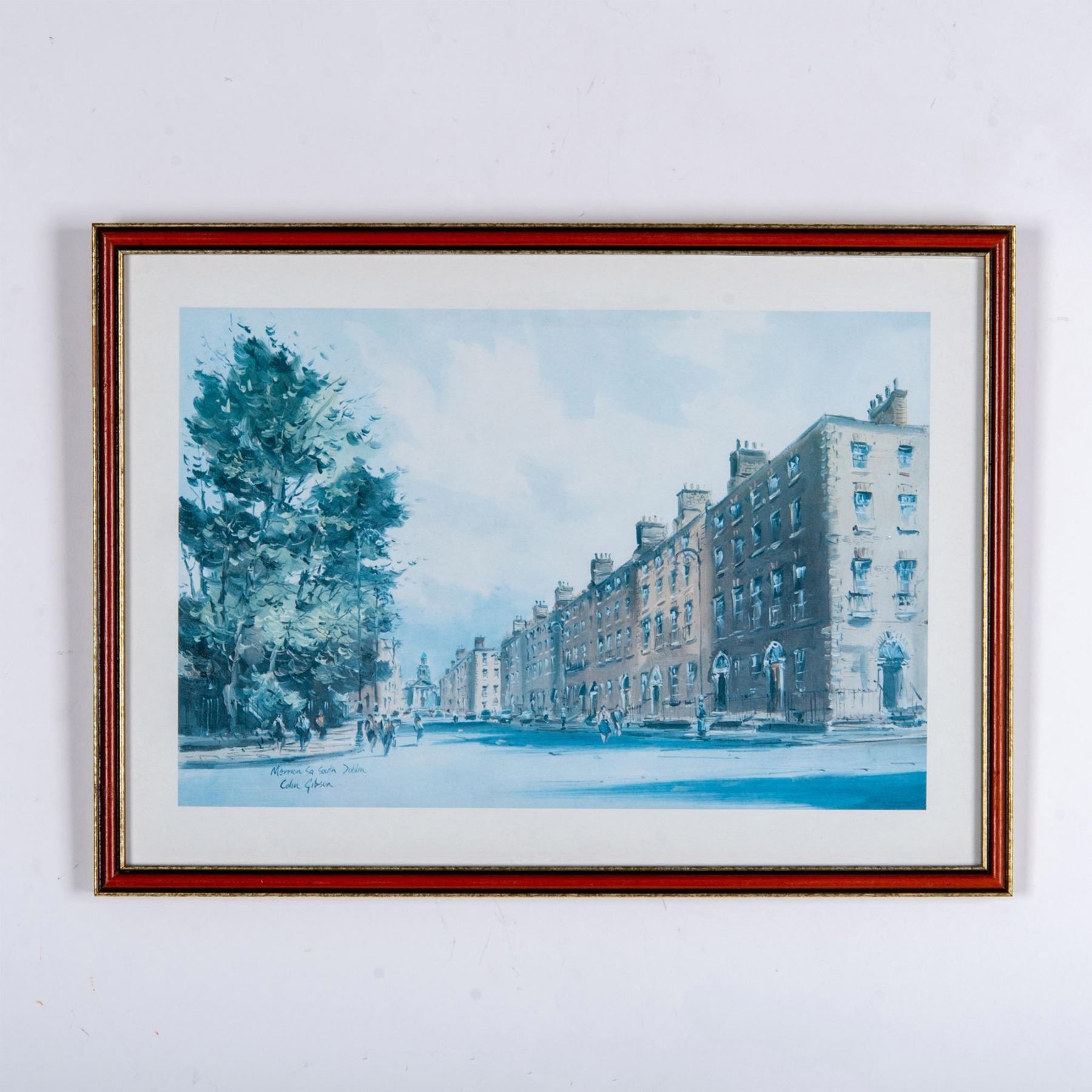 Vintage color print on paper after Irish Realist artist Colin Gibson's original depicting Merrion Square, Dublin. Signature and title in plate on lower right. Housed in a wooden frame. Sight size: 13.50"L x 9.75"H. Frame dimensions: 14.75"L x 10.75"H x 0.75"W. Artwork can be unframed and rolled for shipment.