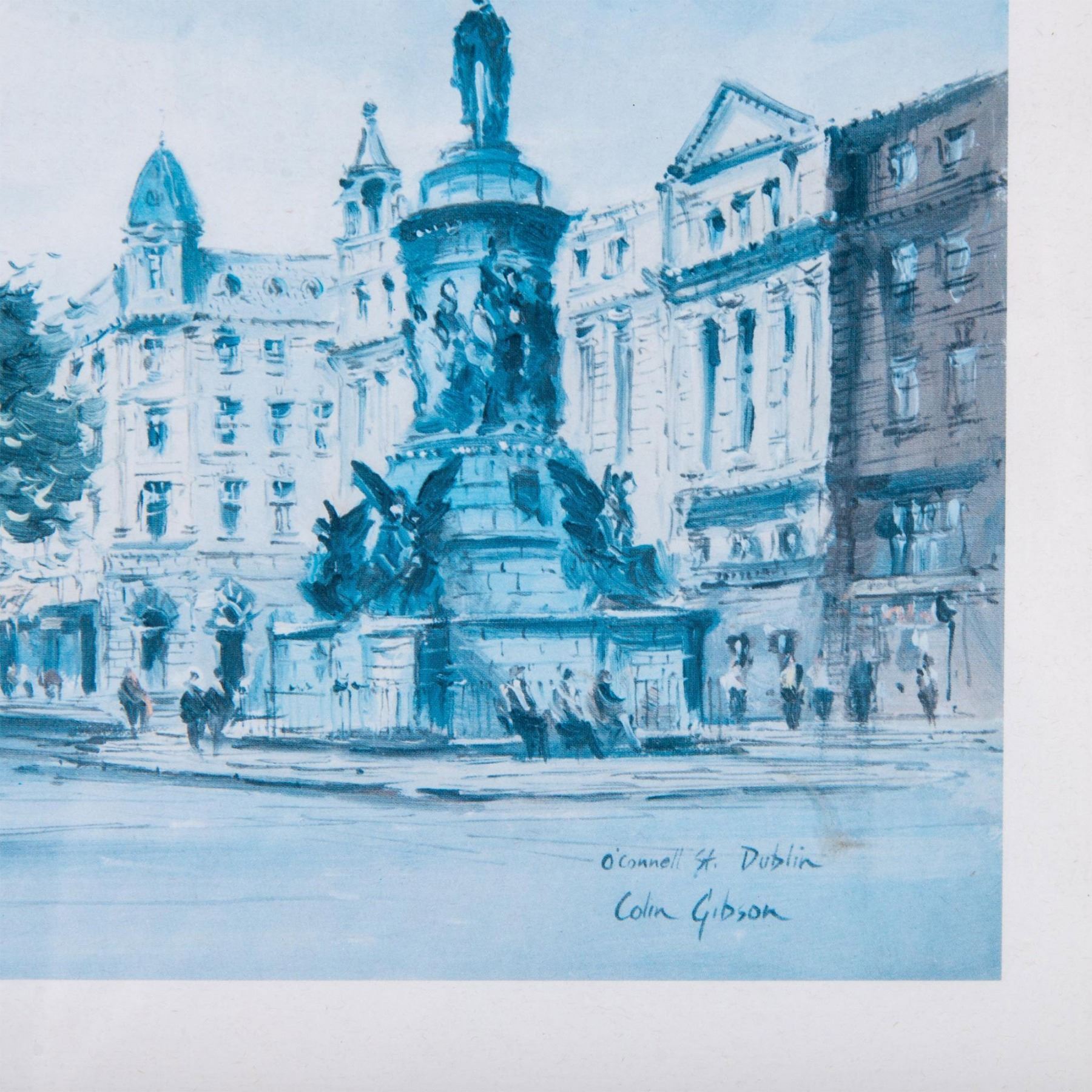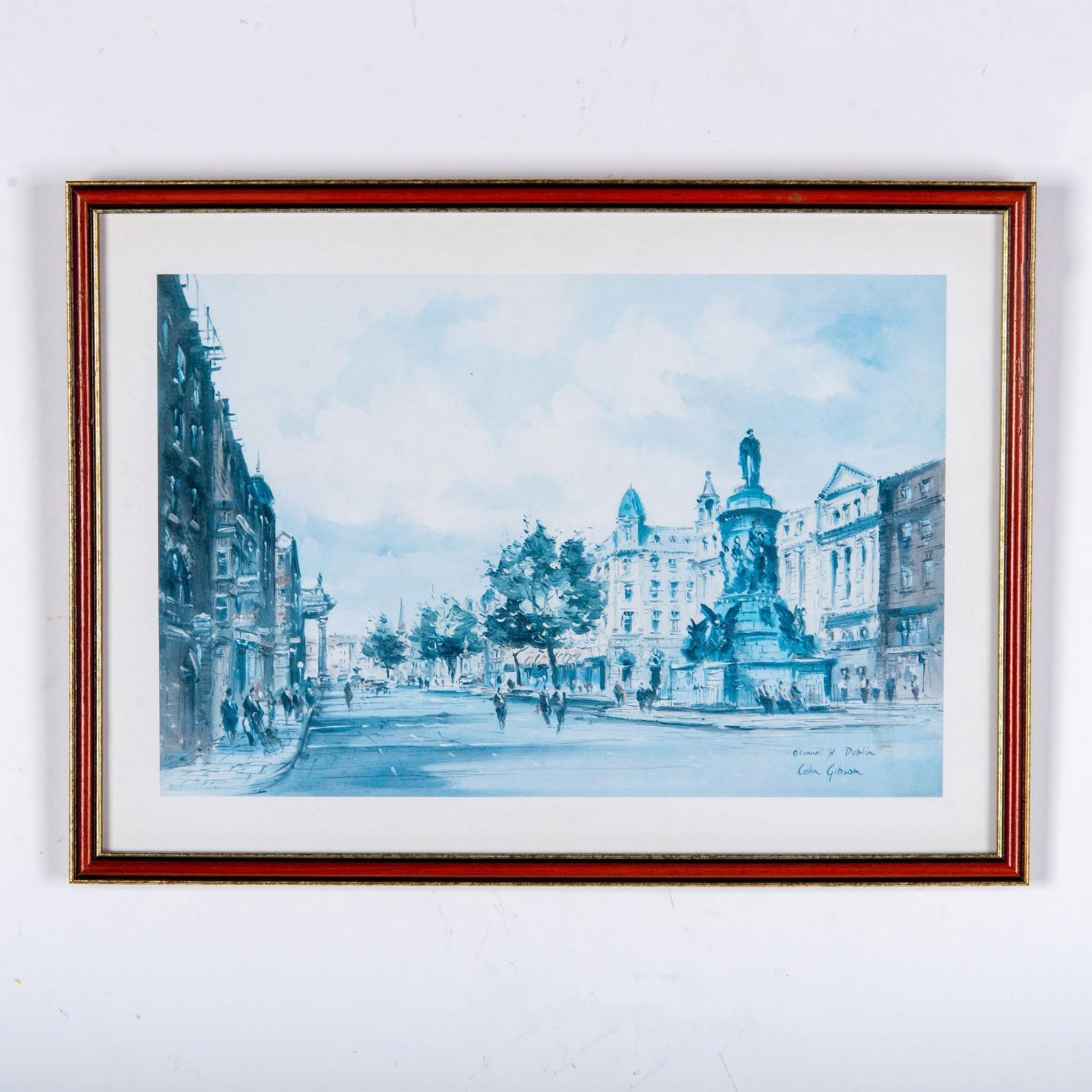 Vintage color print on paper after Irish Realist artist Colin Gibson's original oil painting O' Connell Street, Dublin. Signature and title in plate on lower right. Housed in a wooden frame. Sight size: 13.50"L x 9.75"H. Frame dimensions: 14.75"L x 10.75"H x 0.75"W. Artwork can be unframed and rolled for shipment.