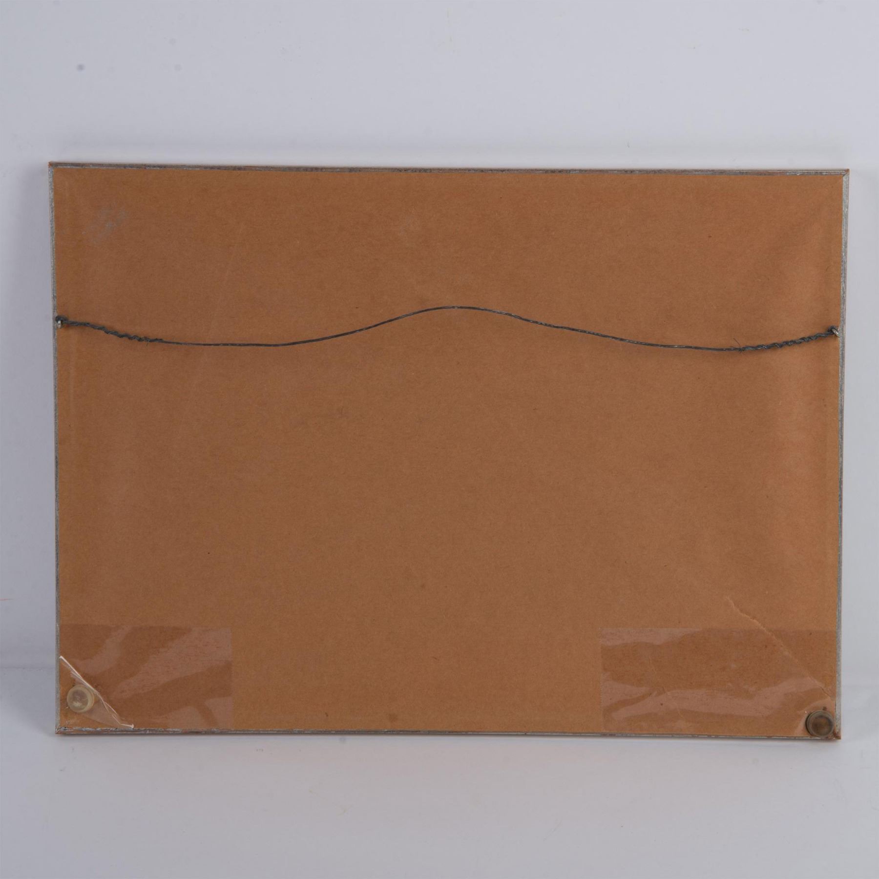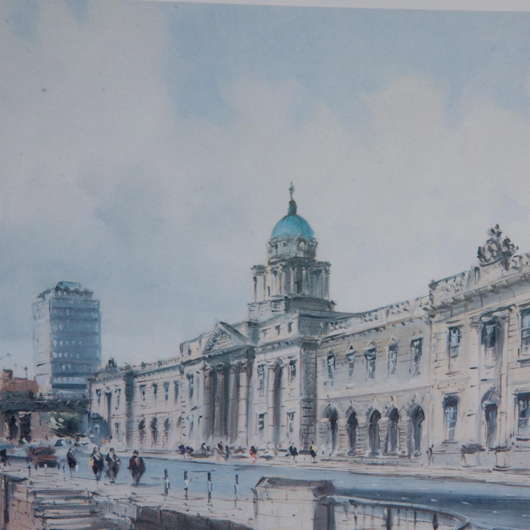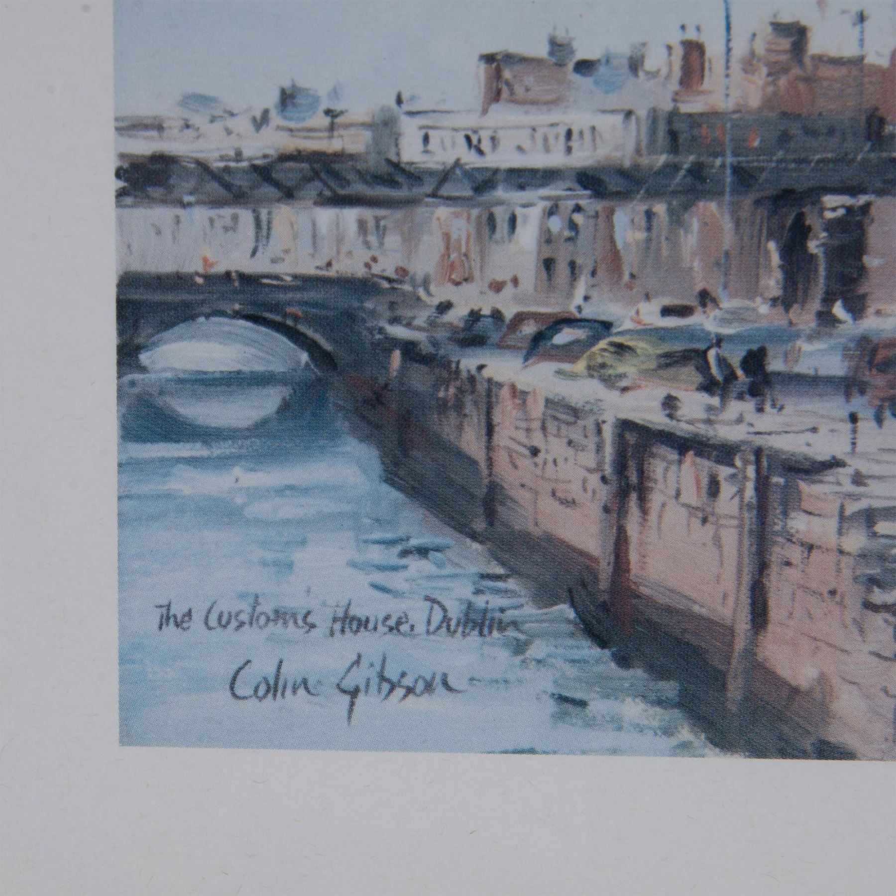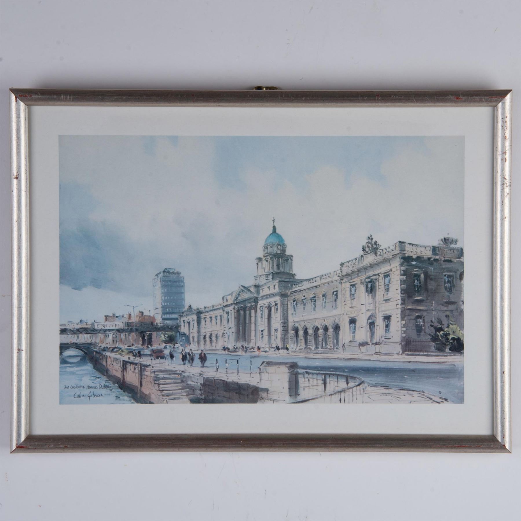 Vintage color print on paper after Irish Realist artist Colin Gibson's original oil painting The Custom's House, Dublin. Signature and title in plate on lower left. Housed in a silver gilt wood frame. Sight size: 13.50"L x 9.75"H. Frame dimensions: 14.75"L x 10.75"H x 0.75"W. Artwork can be unframed and rolled for shipment.