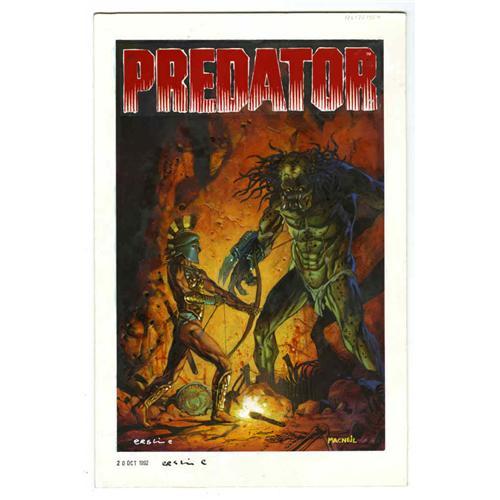 <B>Gary Erskine and Colin MacNeil - Predator Cover Original Art (1992).</B></I> Our favorite intergalactic rasta hunter faces the bow of an ancient warrior, in this striking collaboration between Gary Erskine and Colin MacNeil. Gary Erskine has created powerful and highly detailed art for Marvel Comics, including the <B>Wolverine/Punisher</B></I> limited series and <B>Warheads</B></I>, and Dark Horse Comics' <B>Star Wars</B></I>. Colin MacNeil is one of Scotland's most respected artists, especially for his <B>Judge Dredd</B></I> and <B>Chopper</B></I> work for 2000 A. D. Hand-inked and hand-painted on a heavy sheet of illustration board, the art has an image area of 8.75" x 13.25". In Excellent condition, and signed by Gary Erskine and Colin MacNeil along the bottom.
