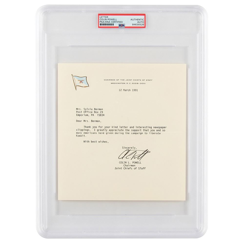 TLS signed “C. L. Powell,†one page, 7.25 x 7.75, Chairman of the Joint Chiefs of Staff letterhead, March 12, 1991. Letter to Sylvia Berman, in full: "Thank you for your kind letter and interesting newspaper clippings. I greatly appreciate the support that you and so many Americans have given during the campaign to liberate Kuwait." In fine condition. Encapsulated in a PSA/DNA authentication holder.