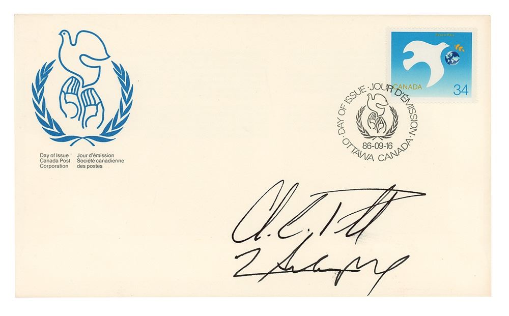 Canadian FDC with a cachet honoring peace, signed in black felt tip by Colin Powell and Norman Schwarzkopf. In very fine condition.