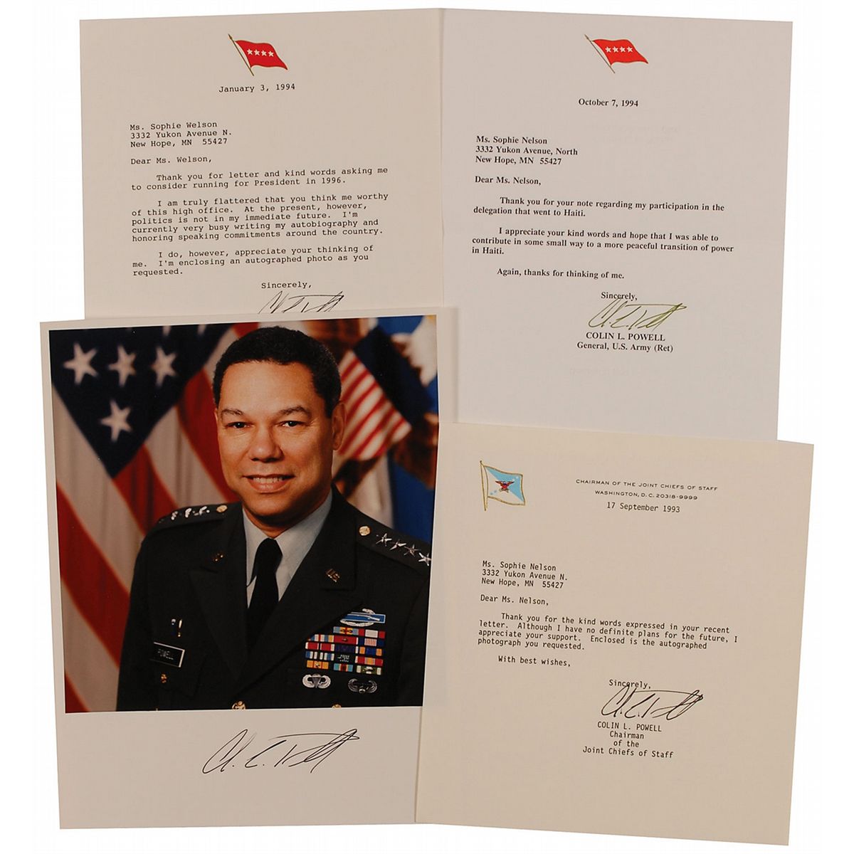 Four items: three TLSs, each one page, approximately 7 x 8.5, dated between 1993 and 1994, all responding to an admirer; and one color satin-finish 8 x 10 photo of Powell in uniform, signed in the lower border in black felt tip. In overall fine condition.