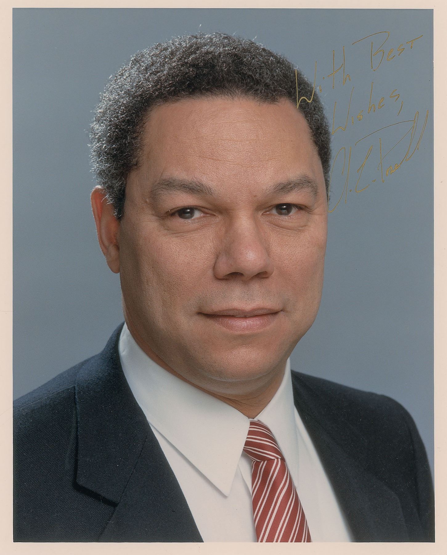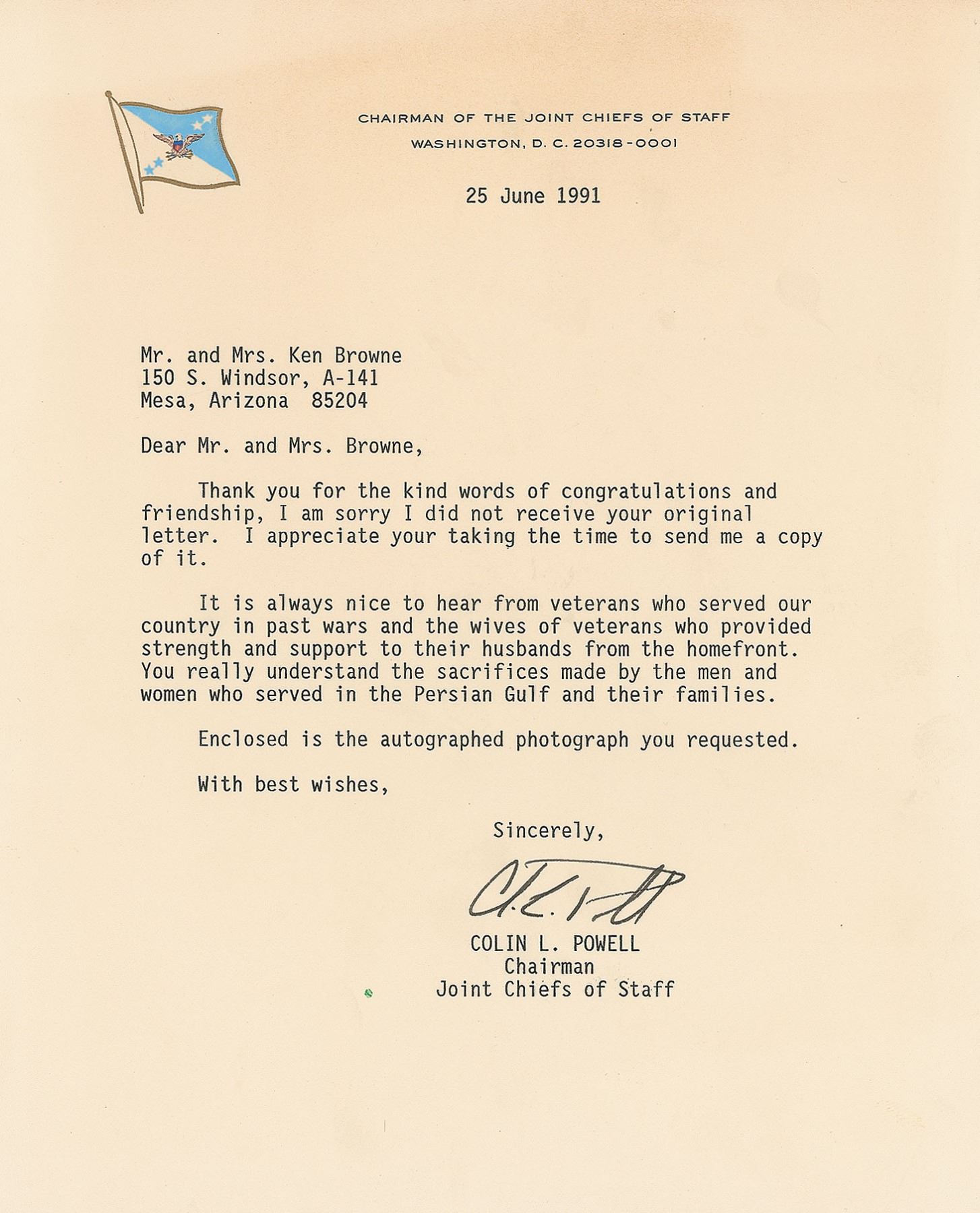 Two items: a color satin-finish 8 x 10 photo of Powell in a suit and tie, signed in gold ink; and a TLS, one page, 7.25 x 9, Chairman of the Joint Chiefs of Staff letterhead, June 25, 1991, in part: "It is always nice to hear from veterans who served our country in past wars and the wives of veterans who provided strength and support to their husbands from the homefront. You really understand the sacrifices made by the men and women who served in the Persian Gulf and their families." In overall very good to fine condition, with scattered light surface creasing to the photo, and light toning to the letter.