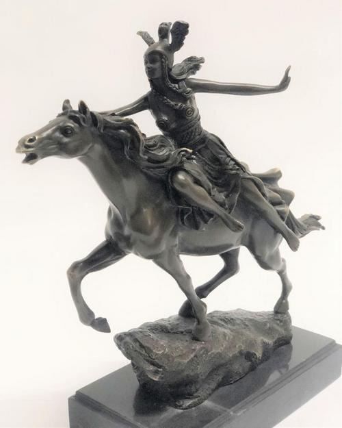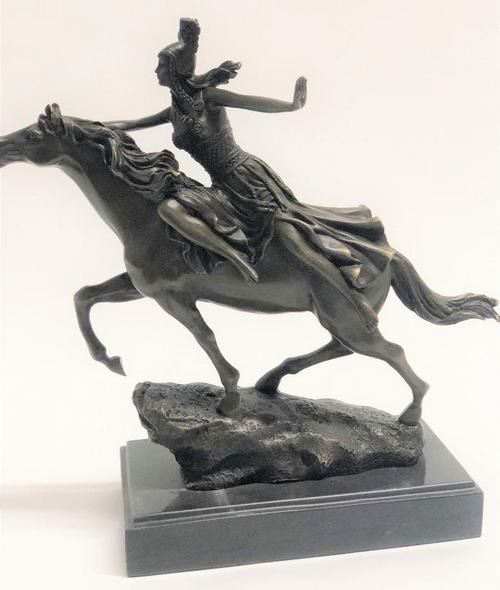 She flees on the back of her speedy and loyal horse. Gripping his reins with one hand, she side straddles the horse and they speed into the distance. His strong muscles flex as his hooves pound the dirt terrain. Her dress whips to the side in the dry wind, exposing her long lean legs. 100% bronze and handmade, this brown patina sculpture was cast using the Lost Wax Method and mounted on a marble base and is signed Colinet.