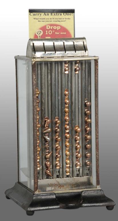 Circa 1900. Complete with key and a supply of collar buttons. Only moderate wear overall. Paper sign on top is a reprint. Vending Machine Condition (Very Good - Excellent). Size 5 - 1/2" x 12" x 5 - 1/2".