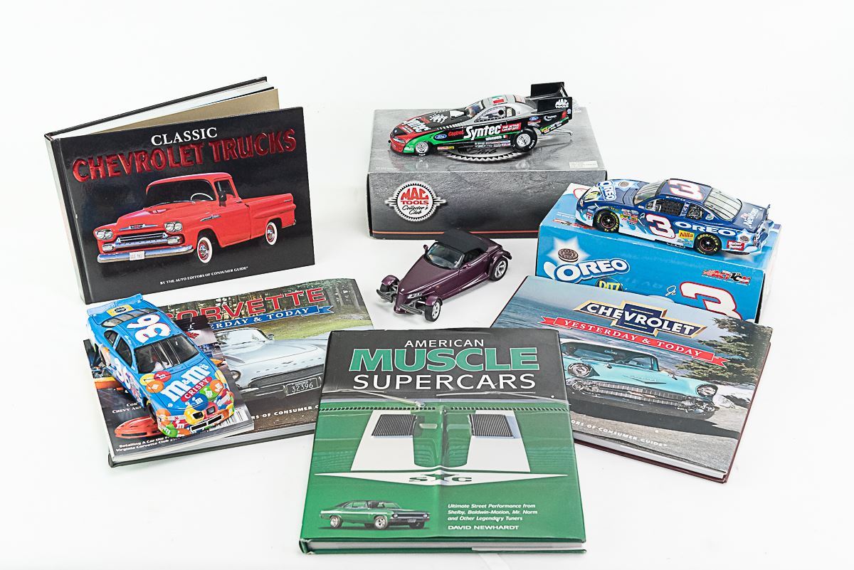 Lot consists of 4 books on cars and 5 model cars, 4 by MAC Tools collectors club (NHRA & NASCAR) including a Dale Earnhardt Jr. Books cover various muscle and classic car types. Overall very good condition. See photos.