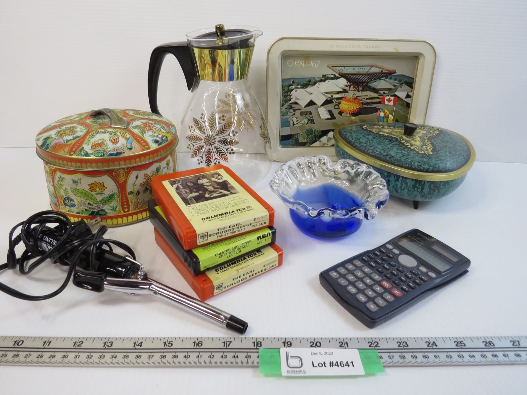 Collectable Tins - Glass Blown Dish - (3) 8 Track Tapes - Curling Iron - Misc Items