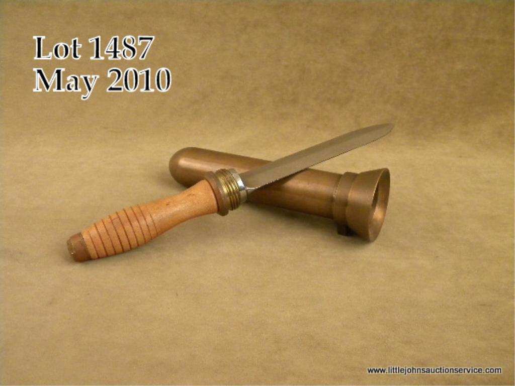 Collectible Diver’s knife, approx. 13” overall with a 7” blade and a heavy brass cylindrical “sheath” in overall excellent condition; the knife’s blade is unmarked, the grip is a round grooved light wood and the simple brass pommel ismarked “VULCAN” and “EX-L-O”; the knife screws into the brass shealth and there is an integral belt hook on the throat of the sheath. Est.: $150-$300.