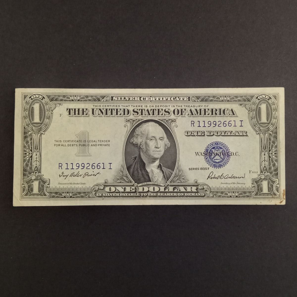 Collectible Faulty Alignment /Miscut Error 1935F US $1 One dollar silver certificate bill blue seal. #R11992661I. Condition good.