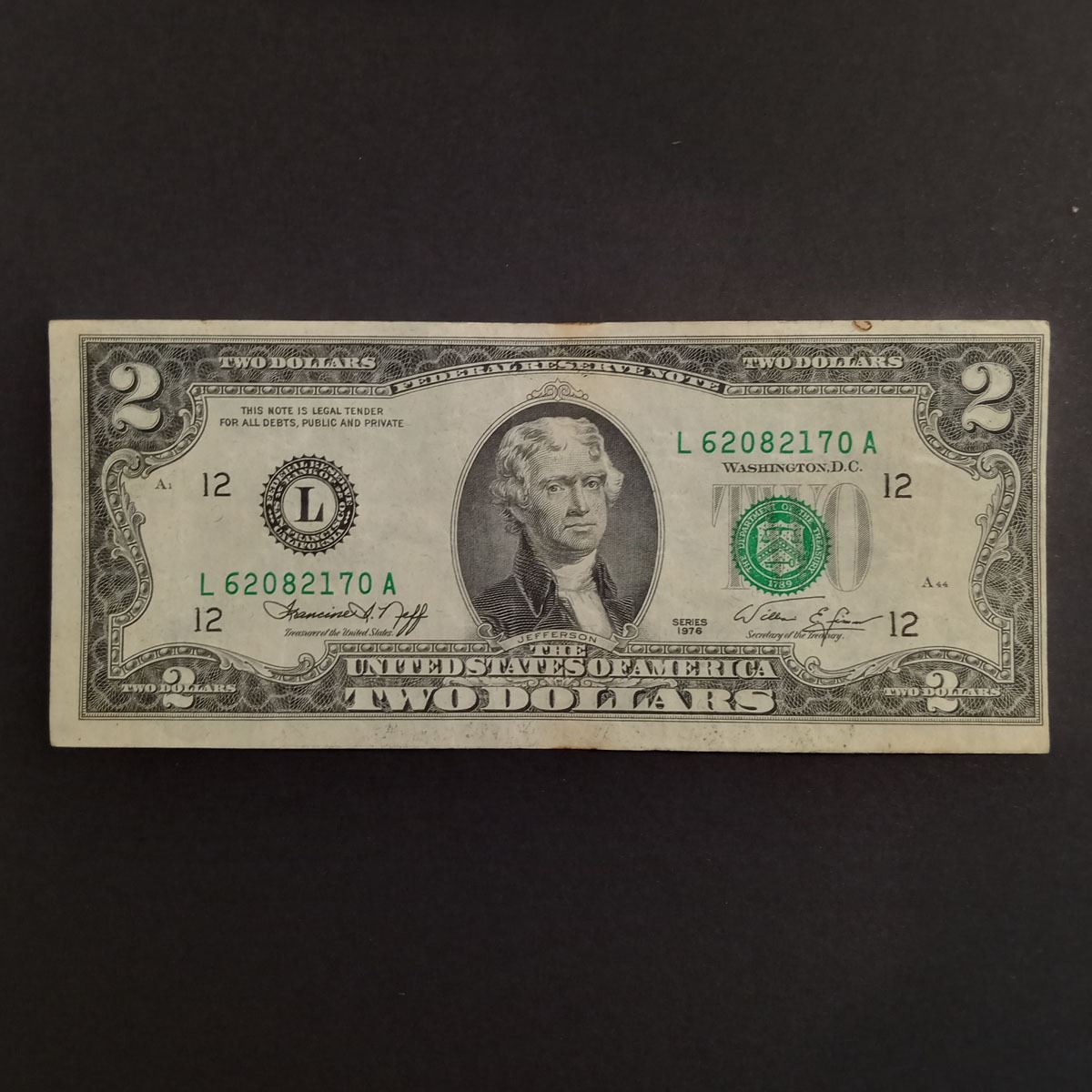 Collectible Faulty Alignment /Miscut Error 1976 US $2 Two dollars bill note green seal. #L 62082170 A. Condition very good. Bill is crisp.